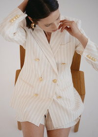 The Walter Double Breasted Jacket is meticulously tailored from our soft twill suiting. It features peak lapels, jetted pockets at the front, a single angled chest pocket and back vent. The subtle shoulder pads and nipped waist offer a flattering and feminine touch to the silhouette. It's fully lined and finished with six gold crest buttons. SKU: TP522041LSU - 53% Linen, 45% Rayon, 2% Spandex - Imported SIZE & FIT Length from shoulder to hem is 29” | Sleeve Length is 30.5", based on a size 2. Our model is 5’10” and is wearing a size 2. This style runs true to size. FEATURES & DETAILS - Dry clean only