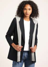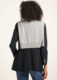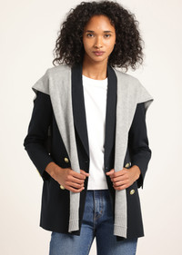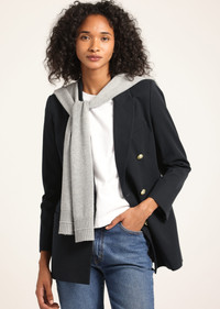 The Walter Double Breasted Jacket is meticulously tailored from our soft twill suiting. It features peak lapels, jetted pockets at the front, a single angled chest pocket and back vent. The subtle shoulder pads and nipped waist offer a flattering and feminine touch to the silhouette. It's fully lined and finished with six gold crest buttons. Add versatility to your wardrobe with our shrug- the ultimate accessory to throw on and off, effortlessly elevating your look. A single layer sweater crafted from a soft cotton and merino wool blend, the shrug is designed to create a layered yet sleek silhouette. Made to be worn with our Walter jacket, it features a gold button at the back to secure in place. SKU: TF512041SSFT - 57% Cotton, 37% Viscose, 6% Spandex / Combo: 90% Polyester, 10% Cotton / Lining: 100% Polyester - Imported SIZE & FIT Length from shoulder to hem is 29”, based on a size 2. Our model is 5’10” and is wearing a size 2. This style runs true to size. FEATURES & DETAILS - Dry clean only
