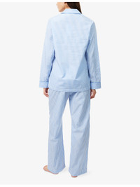 PRODUCT DETAILS - Derek Rose cotton-poplin pyjama set - 100% cotton - Exposed button fastening at front - Top: relaxed fit, notch collar, long sleeves, patch pocket at front, all-over striped print, contrast piping - Bottoms: relaxed fit, high-rise, straight leg, drawstring elasticated waistband, two slip pockets at front, all-over striped print - Machine wash at 30°C - True to size - Model is 5ft 10in/1.78m and wears a size small - Lightweight, slight stretch Ref: R04540281