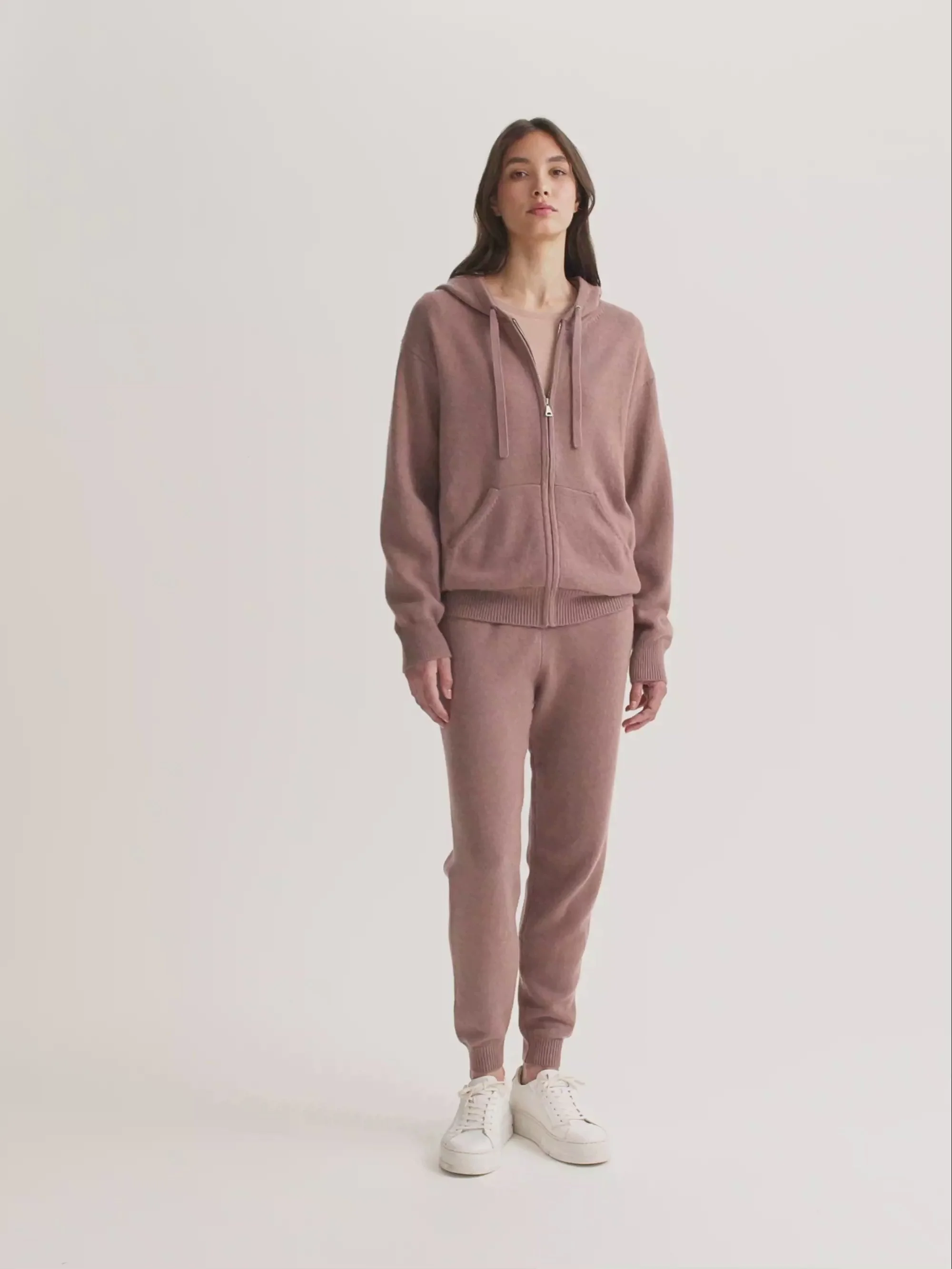 Effortless luxury in a relaxed silhouette Wrap yourself in pure comfort with the Daphne Hoodie in rosewood—a relaxed-fit zip-through style crafted from 100% Italian Cariaggi cashmere. Supremely soft and lightweight, this hoodie offers the perfect balance of laid-back luxury and everyday versatility. Designed with a relaxed yet flattering fit, the Daphne features dropped shoulders, angled front pockets, a drawstring hood and ribbed cuffs and hem for ease of movement and subtle structure. The rosewood hue adds a serene touch, ideal for layering through the seasons. Spun from sustainably sourced Cariaggi cashmere—renowned for its exceptional softness, warmth and durability—this hoodie is hypoallergenic, breathable and gentle on the skin. Perfect for travel, lounging or layering apres-ski, it redefines comfort with a sophisticated edge. We recommend sizing down if you prefer a more regular fit. Keep your cashmere looking its best with our Beechwood Cashmere Comb . Model is 5’9.5” / 177cm tall., wearing a size Small. PRODUCT DETAILS Composition: 100% Cashmere Fabric Weight: Medium Pattern: Plain Sleeve Length: Long Sleeve Country of Origin: Mauritius Item Number: 1519-DAPH016BRO