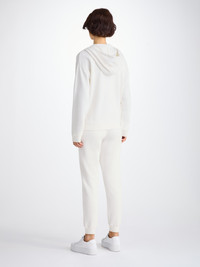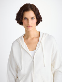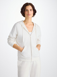 A new addition to our women's collection, our Quinn hoodie is stylish, yet practical. Featuring zipped front pockets with welts and with ribbed cuffs and neck trim, this hoodie is designed to hold its shape wash after wash. The Quinn fabric combines all the key qualities of our cotton and micro modal; it's durable and has great colour retention, meaning it can withstand long-lasting wear and the white colour won't fade. With a thermoregulating fabric, this hoodie is perfect for warm days and cool evenings. Complete with a breathable quality, our Quinn hoodie is ideal for exercise. But perhaps most importantly, it's forever soft, seriously - you won't believe the quality. To make it truly special, we can personalise your garment with initials or a motif. Read more about our personalised service here . The model is 5’9.5” / 177cm tall . She wears a size Small. PRODUCT DETAILS Material: Cotton/Micro Modal Fabric Weight: Medium Fabric Type: Jersey Gender: Women's Colour: White Pattern: Plain Sleeve Length: Long Sleeve Season: 25-W Country of Origin: Portugal Composition: 68% Cotton 32% Modal Fit: Regular Fit Item Number: 1524-QUIN001WHI