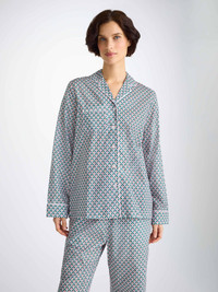 Our light, pure cotton pyjamas are perfect when the temperature rises. Made from ultra-fine batiste cotton, this is a soft, lightweight and cool PJ that's perfect for midsummer wear. It's long been a favourite fabric weight to take on holiday, as it's not only comfortable in warm climates, but also light to pack and easy to carry. Hand drawn in a geometric print, the scalloped leaf design features a dark green and pink tone. Our scalloped leaf print pyjama jacket features a sartorially inspired curved collar, button through jacket and a piped breast pocket. Furthermore, the rest of the jacket is piped throughout with complementary white. Matching the top in the detail stakes, the trousers feature side pockets, an elasticated waist for comfort. To make it truly special, we can personalise your garment. We offer a range of options including monogramming, motifs, and secret messages. Read more about our personalised services here . The model is 5’9.5” / 177cm tall . She wears a size Small. PRODUCT DETAILS Material: Pure Cotton Fabric Weight: Light Fabric Type: Regular Gender: Women's Colour: Jungle Green Pattern: Print Sleeve Length: Long Sleeve Season: 25-W Country of Origin: Czech Republic Composition: 100% Cotton Fit: Regular Fit Item Number: 2012-LEDB088GRE