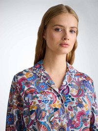 Our light, pure cotton pyjamas are perfect when the temperature rises. Made from ultra-fine batiste cotton, this is a soft, lightweight and cool PJ that's perfect for midsummer wear. It's long been a favourite fabric weight to take on holiday, as it's not only comfortable in warm climates, but also light to pack and easy to carry. Topped with a hand drawn jungle paisley print, combining ornamental paisleys with stylised jungle flowers, foliage and hidden Derek Rose references. Find the Derek Rose cat, a Rose Star and even our classic stripes. Our paisley print pyjama jacket features a sartorially inspired curved collar, button through jacket and a piped breast pocket. Furthermore, the rest of the jacket is piped throughout with complementary white. Matching the top in the detail stakes, the trousers feature side pockets, an elasticated waist for comfort. To make it truly special, we can personalise your garment. We offer a range of options including monogramming, motifs, and secret messages. Read more about our personalised services here . The model is 5’9.5” / 176cm. She wears a size Small. PRODUCT DETAILS Material: Pure Cotton Fabric Weight: Light Fabric Type: Regular Gender: Women's Colour: Multi Pattern: Print Sleeve Length: Long Sleeve Season: 25-W Country of Origin: Czech Republic Composition: 100% Cotton Fit: Regular Fit Item Number: 2012-LEDB089MUL