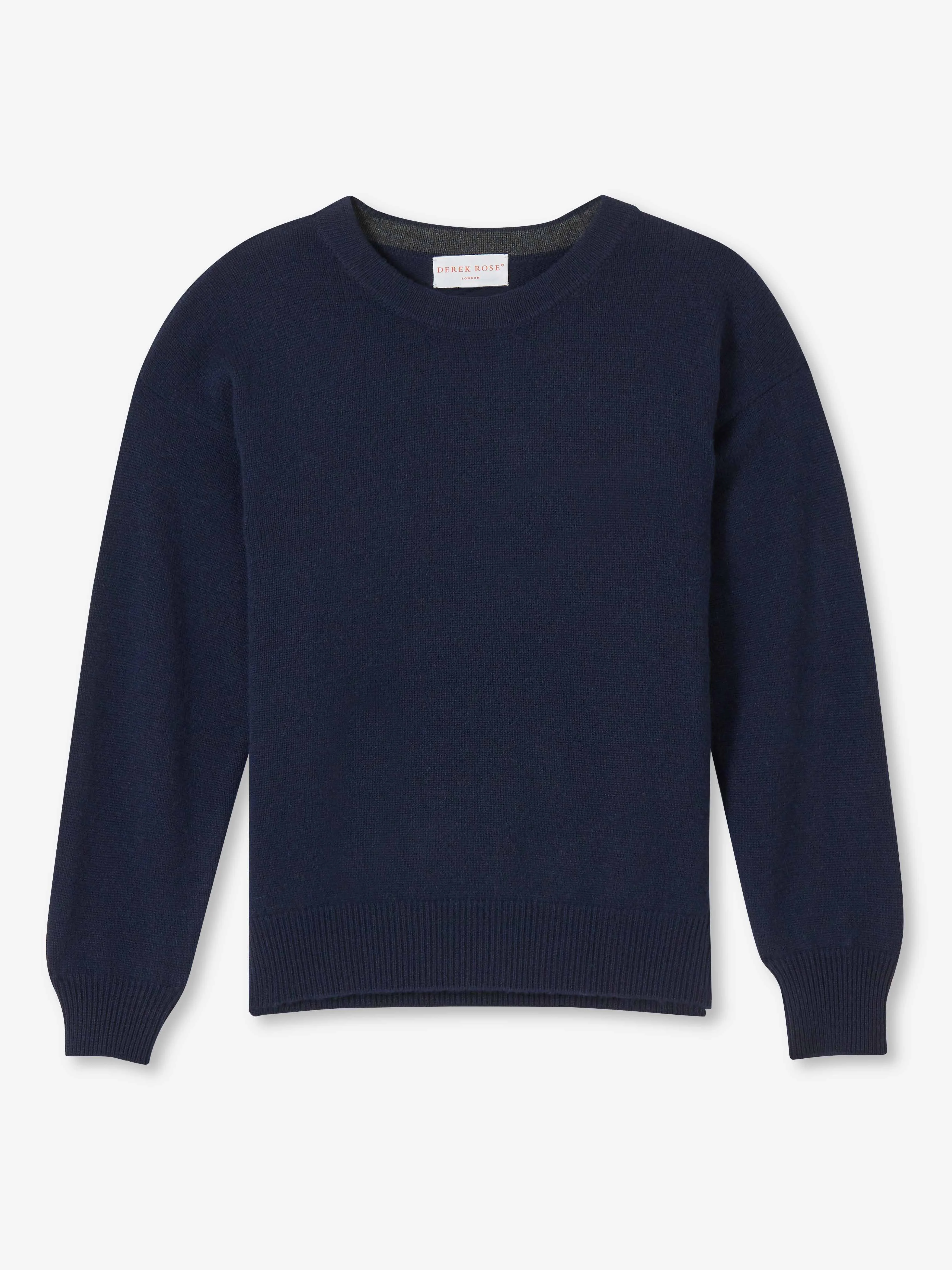 Our new Daphne women's cashmere sweater in classic navy has a flattering but relaxed fit, with the addition of dropped shoulders it's perfect for both lounging at home and off-duty weekend attire. The starting point for Daphne was the grade of pure cashmere we chose — a luxuriously soft pure Italian cashmere made by Carriagi, which we consider to be best in class. Touch this fabric and you'll be reminded what cashmere should feel like. The material hangs wonderfully, for a look that's as luxurious as the feel. The Daphne is part of our premium line of luxury leisurewear, born out of the desire to create a garment that looks effortlessly chic but is still as comfortable to slip into. Lightweight and easy to fold and pack into your luggage, this sweater also makes for the perfect off-piste ski attire. The model is 5' 9" / 176cm tall with waist size 24” / 60cm, bust size 34” / 87cm. She wears a size Small. PRODUCT DETAILS Material: Pure Cashmere Fabric Weight: Medium Fabric Type: Jersey Gender: Women's Colour: Navy Pattern: Plain Sleeve Length: Long Sleeve Season: 24-W Country of Origin: Mauritius Composition: 100% Cashmere Fit: Relaxed Fit Item Number: 1522-DAPH010NAV