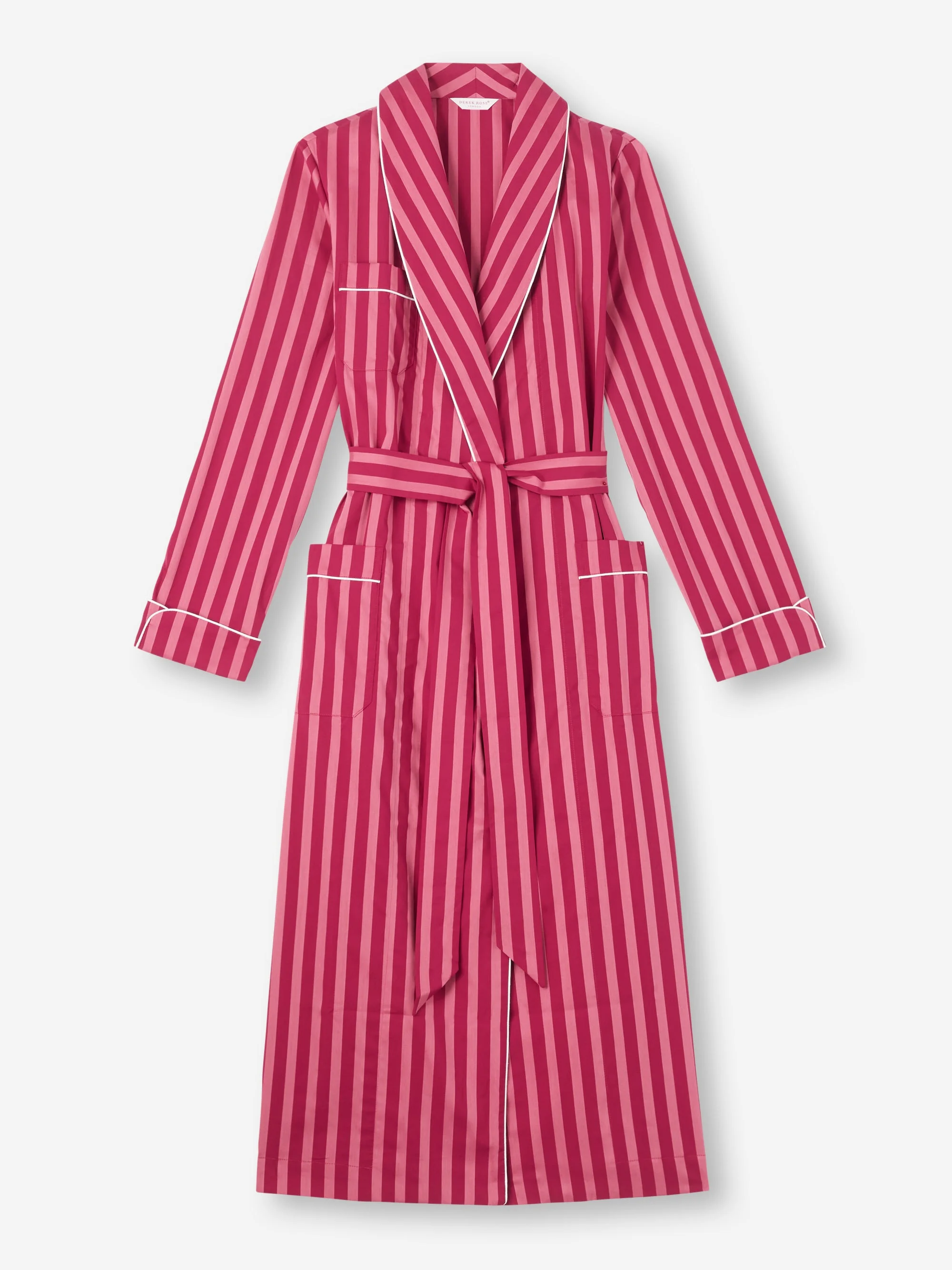Designed to enhance your free time, our calf length dressing gown features two side seam pockets and a chest pocket ready for monogramming, a shawl style collar and a waist-tie for an effortlessly stylish finish. Our cotton batiste has become a firm favourite of our customers, thanks to its breathability, lightweight properties and luxuriously soft feel. With its stylish pink stripe, this gown is the perfect choice for breakfast at home or for weekends away with loved ones. To make it truly special, we can personalise your garment with initials or a motif. Read more about our personalised service here . The model is 5’9.5” / 176cm. She wears a size Small. PRODUCT DETAILS Material: Pure Cotton Fabric Weight: Light Fabric Type: Satin Gender: Women's Colour: Pink Pattern: Stripe Sleeve Length: Long Sleeve Season: 25-W Country of Origin: Czech Republic Composition: 100% Cotton Fit: Regular Fit Item Number: 2750-CAPR025PIN