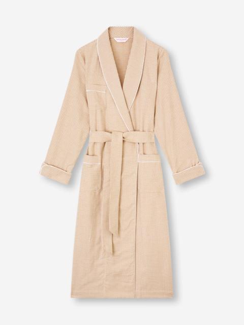Indulgent softness with timeless check design. Our women's Kelburn dressing gown is designed for a relaxed yet elegant fit, cut to calf length and finished with a self-fabric shawl collar, waist tie, two side seam pockets and a chest pocket ready for monogramming. White piping frames the timeless beige houndstooth pattern for a refined touch. Made from our signature winter-weight brushed cotton, the fabric is soft, warm and breathable. Using a unique brushing technique, the fibers are combed for an exceptionally smooth handle, offering comfort that lasts season after season. Perfect for cozy evenings or slow mornings, this gown combines classic style with indulgent warmth. Add a personal touch with monogramming or a motif. Model is 5’10.5” / 179cm, wearing a size Small. PRODUCT DETAILS Composition: 100% Cotton Fabric Weight: Heavy Pattern: Stripe Sleeve Length: Long Sleeve Country of Origin: Czech Republic Item Number: 2750-KELB051BEI