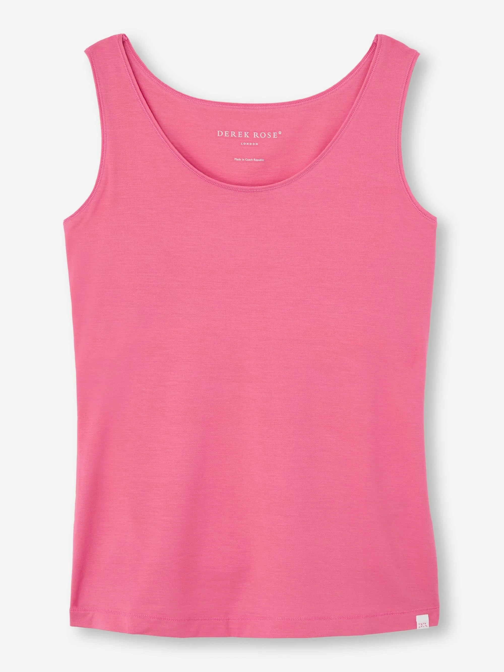 The luxurious finesse of this beautiful fabric is complemented by a scooped neck with soft fabric binding and wide straps for extra comfort. The inner support panel gives this vest a superior fit, allowing it to be worn as a base layer or on its own. Based on our best-selling men's Basel stretch micro modal fabric, the Lara is slightly lighter weight whilst being ultra-soft and versatile. Not only is the fabric soft, but thermostatic properties in the micro modal fibres allow them to react to changes in temperature and regulate your body heat. What's more, the flamingo pink toned Lara fabric retains its initial softness and colour wash after wash and is also environmentally friendly; made from sustainably forested European beech trees using a process that is carbon neutral. The model is 5’9.5” / 176cm. She wears a size Small. PRODUCT DETAILS Material: Micro Modal Stretch Fabric Weight: Medium Fabric Type: Jersey Gender: Women's Colour: Flamingo Pink Pattern: Plain Sleeve Length: Sleeveless Season: 25-W Neck Shape: Crew Neck Country of Origin: Czech Republic Composition: 95% Modal 5% Elastane Fit: Slim Fit Item Number: 1189-LARA008PIN