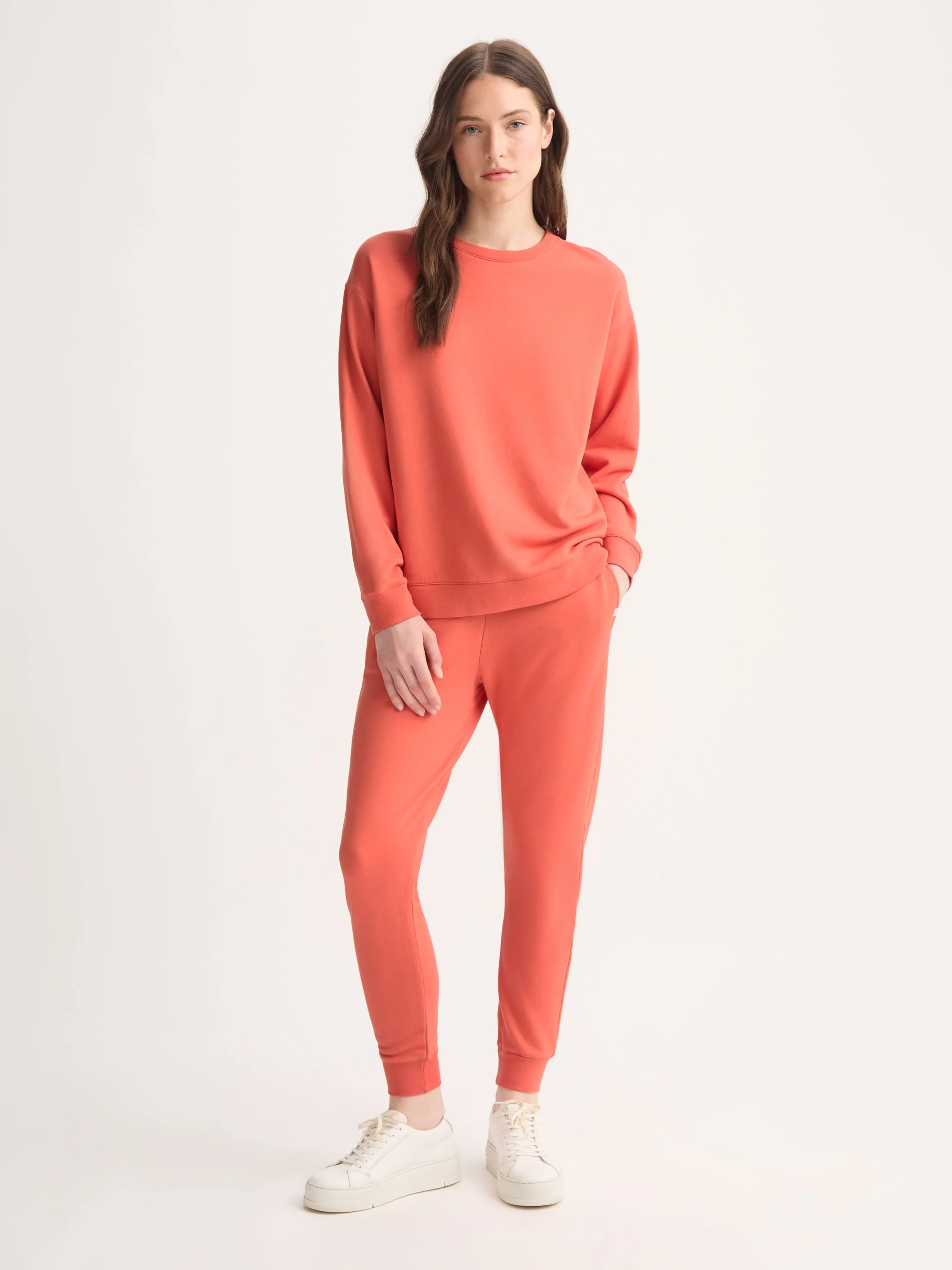 Relaxed sophistication, endless comfort The Quinn sweatshirt in coral orange brings a fresh, uplifting tone to everyday dressing, while maintaining the effortless comfort the style is known for. Designed with a relaxed, oversized fit and dropped shoulders, it offers an easy silhouette that feels as good as it looks. Crafted from our signature cotton and micro modal blend, the fabric is exceptionally soft, breathable and naturally thermoregulating—keeping you comfortable throughout the day. Ribbed cuffs, hem and collar provide subtle structure, while ensuring the sweatshirt retains its shape and colour wash after wash. Perfect for layering over loungewear or pair with the matching sweatpants for a refined off-duty look, the Quinn sweatshirt is a versatile staple for relaxed days at home or casual outings. Model is 5’9.5” / 177cm tall, wearing a size Small. PRODUCT DETAILS Composition: 68% Cotton 32% Modal Fabric Weight: Midweight Pattern: Plain Sleeve Length: Long Sleeve Country of Origin: Portugal Item Number: 1509-QUIN001COR