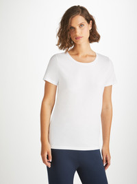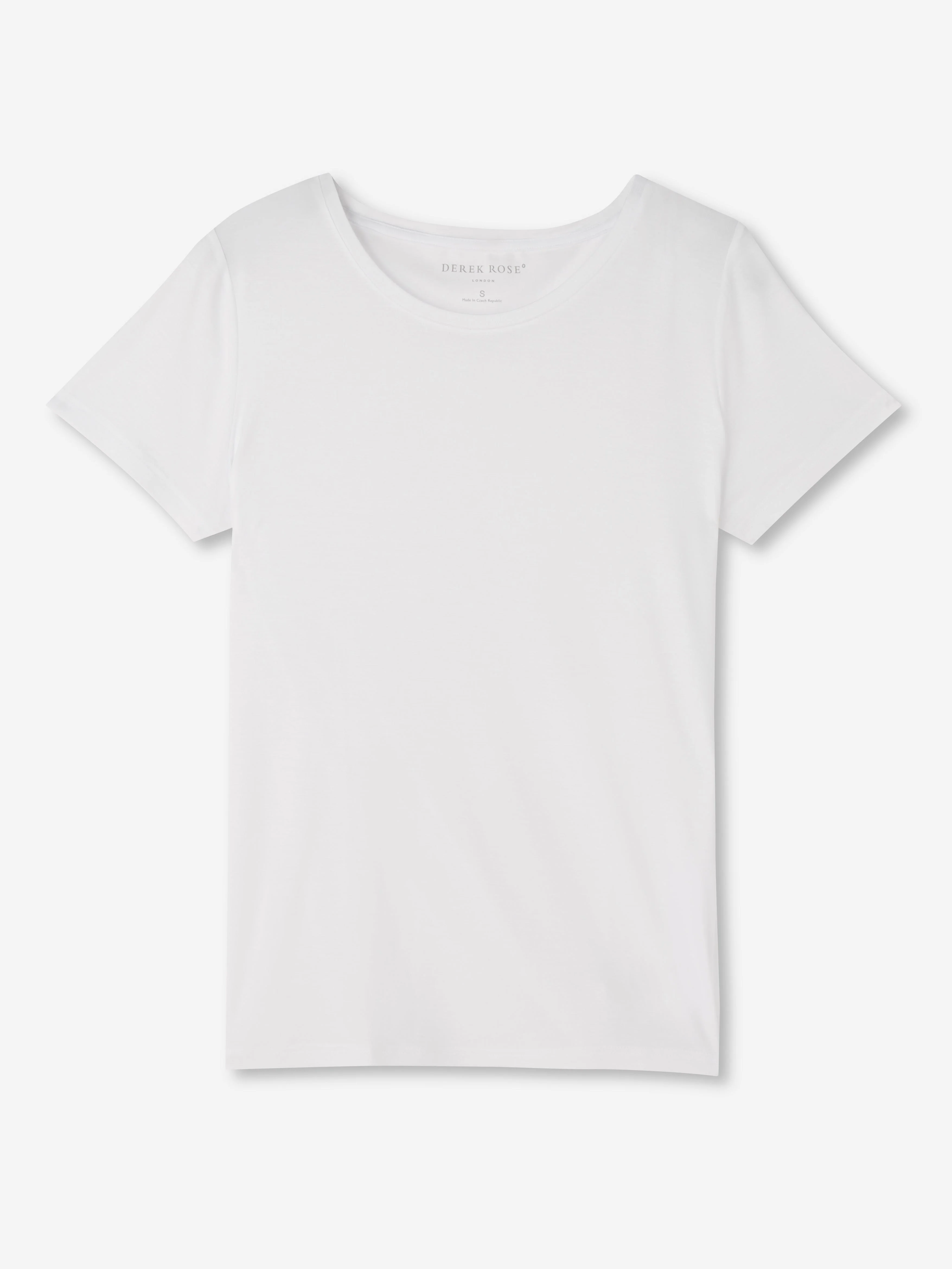 Perfected over numerous years, our women's white leisure t-shirt is an effortlessly chic sport-luxe essential. The Lara fabric is a weight between Basel and Carla, meaning it has enough coverage to be worn out the house and also offers good breathability, making it perfect for warmer climates. Not only is the Lara versatile, it has maintained the super-soft fabric quality and stretch composition that we know you love. What's more, the Lara fabric retains its initial softness and colour and is also responsibly and ethically sourced; spun and knitted in Europe. To make it truly special, we can personalise your garment with initials or a motif. Read more about our personalised services here . The model is 5’9.5” / 177cm tall with waist size 24” / 61cm, bust size 31” / 79 cm. She wears a size Small. PRODUCT DETAILS Material: Micro Modal Stretch Fabric Weight: Medium Fabric Type: Jersey Gender: Women's Colour: White Pattern: Plain Sleeve Length: Short Sleeve Season: 24-W Neck Shape: Crew Neck Country of Origin: Czech Republic Composition: 95% Modal 5% Elastane Fit: Regular Fit Item Number: 1227-LARA001WHI