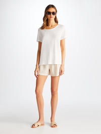Our women's Jordan t-shirt needs to be touched to be believed. Jordan is an exceptionally soft pure linen jersey; this is like no other linen shirt you own. A fabric that typically comes with that rough feeling, our Jordan is cut from a super-soft and lightweight pure linen, knitted with a very fine yarn and finished with a soft wash. Designed to sit in our resort collection, the Jordan is a holiday and hot climate essential. Linen is a natural fibre that comes from the flax plant and boasts characteristics perfect for warmer climates. Linen can absorb up to 20% of its weight in moisture causing it to draw perspiration away from the body. Linen is also fast-drying; the fibres release moisture back into the air very quickly and dry almost instantly because the fibre itself cannot hold air or heat. The Jordan is very breathable as the fibres allow heat to pass through easily; perfect for those welcome gusts of sea breeze on a warm day. Finally, linen is famous for its durability. Washing linen makes it stronger and softer and the tensile strength increases when wet. What can't linen do? The details have been kept minimal for a clean finish and exceptional comfort. Seen here in white, the open crew neck is perfect for relaxed styling. The model is 5’10” / 178cm tall with waist size 24” / 61cm, bust size 32” / 82cm. She wears a size Small. PRODUCT DETAILS Material: Pure Linen Fabric Weight: Light Fabric Type: Regular Gender: Women's Colour: White Pattern: Plain Sleeve Length: Short Sleeve Season: 24-W Neck Shape: Crew Neck Country of Origin: Portugal Composition: 100% Linen Fit: Relaxed Fit Item Number: 1517-JORD001WHI