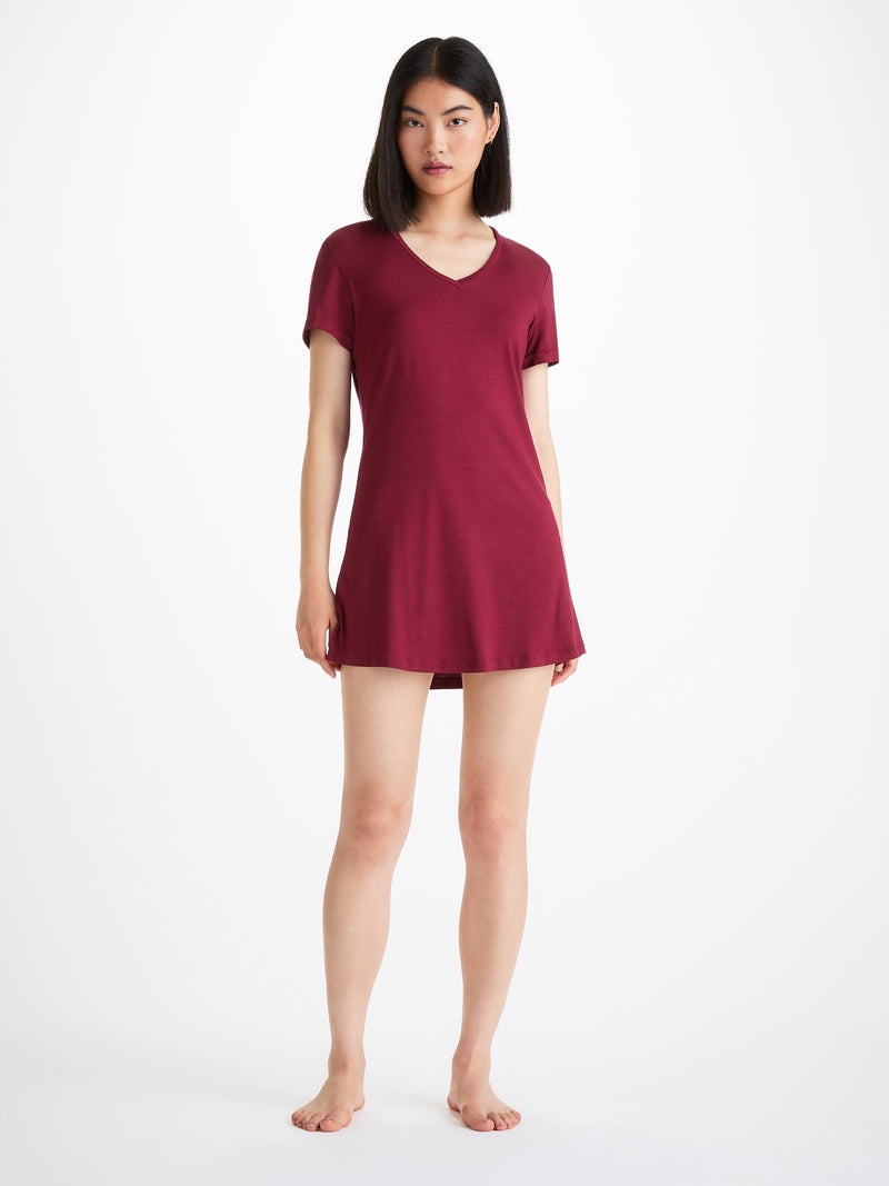 A customer favourite, our Lara sleep t-shirts combine the softest micro modal fabric with a high stretchability - making it perfect for sofa lounging or some deep sleep. Lara originated from a desire to make a lighter-weight version of our signature ultra-soft fabric. What's more, it's even doing its bit for the planet. Our Lara fabric is made from sustainably forested European beech trees. The durability and quality of it mean you’ll be wearing your sleep tee for years to come! This new claret colour is sure to be a crowd pleaser! To make it truly special, we can personalise your garment with initials or a motif. Read more about our personalised services here . The model is 5’10” / 178cm tall. She wears a size Small. PRODUCT DETAILS Material: Micro Modal Stretch Fabric Weight: Medium Fabric Type: Jersey Gender: Women's Colour: Claret Pattern: Plain Sleeve Length: Short Sleeve Season: 25-S Neck Shape: V-Neck Country of Origin: Czech Republic Composition: 95% Modal 5% Elastane Fit: Regular Fit Item Number: 1211-LARA007BUR