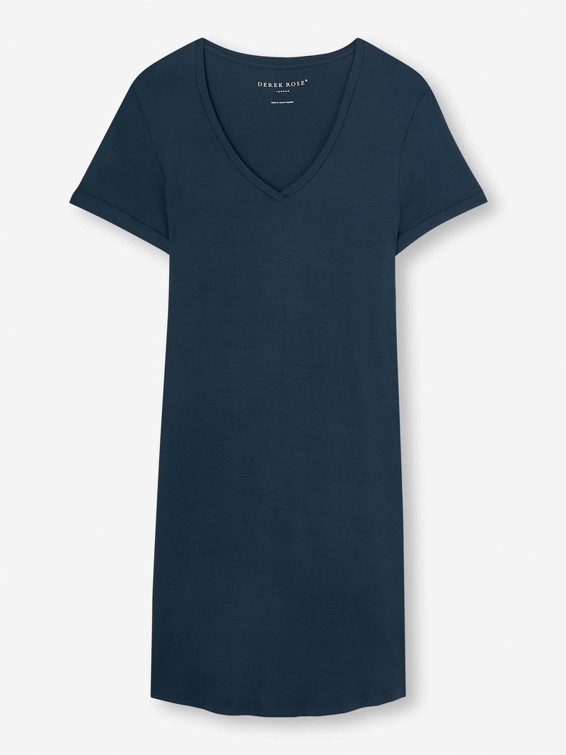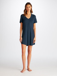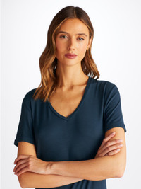Perfect for lounging in when you get home from work, a good nights sleep and then breakfast round the table in the morning - our women's v-neck sleep t-shirt in navy blue works perfectly as a modern alternative to the classic pyjama. The sister fabric to our men's Basel micro modal stretch fabric, the Lara originated from a desire to make a lighter weight version of our signature ultra-soft fabric. We maintained the super-soft fabric quality and stretch composition but achieved a lighter blend that our customers love. Not only is the Lara soft, but thermostatic properties in the micro modal fibres allow them to react to changes in temperature and regulate your body heat, making this luxury sleep tee ideal for sleep. What's more, the Lara fabric retains its initial softness and colour and is also environmentally friendly; made from sustainably forested European beech trees using a process that is carbon neutral. To make it truly special, we can personalise your garment with initials or a motif. Read more about our personalised services here . The model is 5’10” / 178cm tall. She wears a size Small. PRODUCT DETAILS Material: Micro Modal Stretch Fabric Weight: Medium Fabric Type: Jersey Gender: Women's Colour: Navy Pattern: Plain Sleeve Length: Short Sleeve Season: 25-S Neck Shape: V-Neck Country of Origin: Czech Republic Composition: 95% Modal 5% Elastane Fit: Regular Fit Item Number: 1211-LARA001NAV