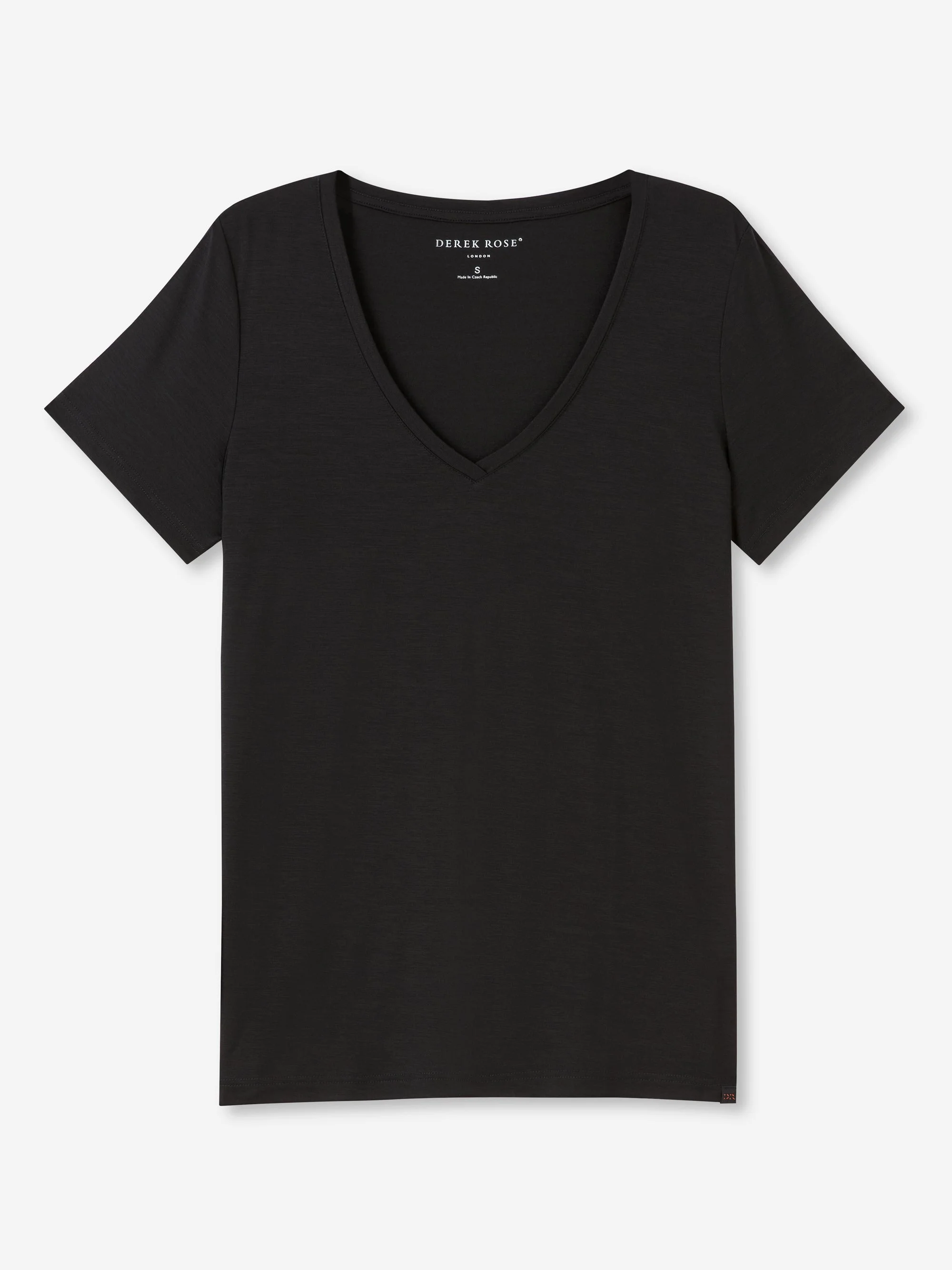 Our Lara t-shirt is a true wardrobe essential and perfect for layering. Seen here in black, it offers a relaxed fit, a soft v-neck and twin needle sleeves and has been designed to sit perfectly underneath all our sweaters and hoodies. The Lara fabric is the sister fabric to our best-selling Basel fabric. It has enough coverage to be worn out of the house and also offers good breathability, making it perfect for warmer climates. Not only is the Lara versatile, but it has also maintained the super-soft fabric quality and stretch composition that we know you love. The Lara fabric is doing its bit for the planet too, sourced from responsibly and ethically sourced European beech trees - it really does stand the test of time! To make it truly special, we can personalise your garment with initials or a motif. Read more about our personalised services here . The model is 5’9.5” / 177cm tall with waist size 24” / 61cm, bust size 31” / 79 cm. She wears a size Small. PRODUCT DETAILS Material: Micro Modal Stretch Fabric Weight: Medium Fabric Type: Jersey Gender: Women's Colour: Black Pattern: Plain Sleeve Length: Short Sleeve Season: 24-W Neck Shape: V-Neck Country of Origin: Czech Republic Composition: 95% Modal 5% Elastane Fit: Regular Fit Item Number: 1281-LARA001BLA