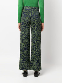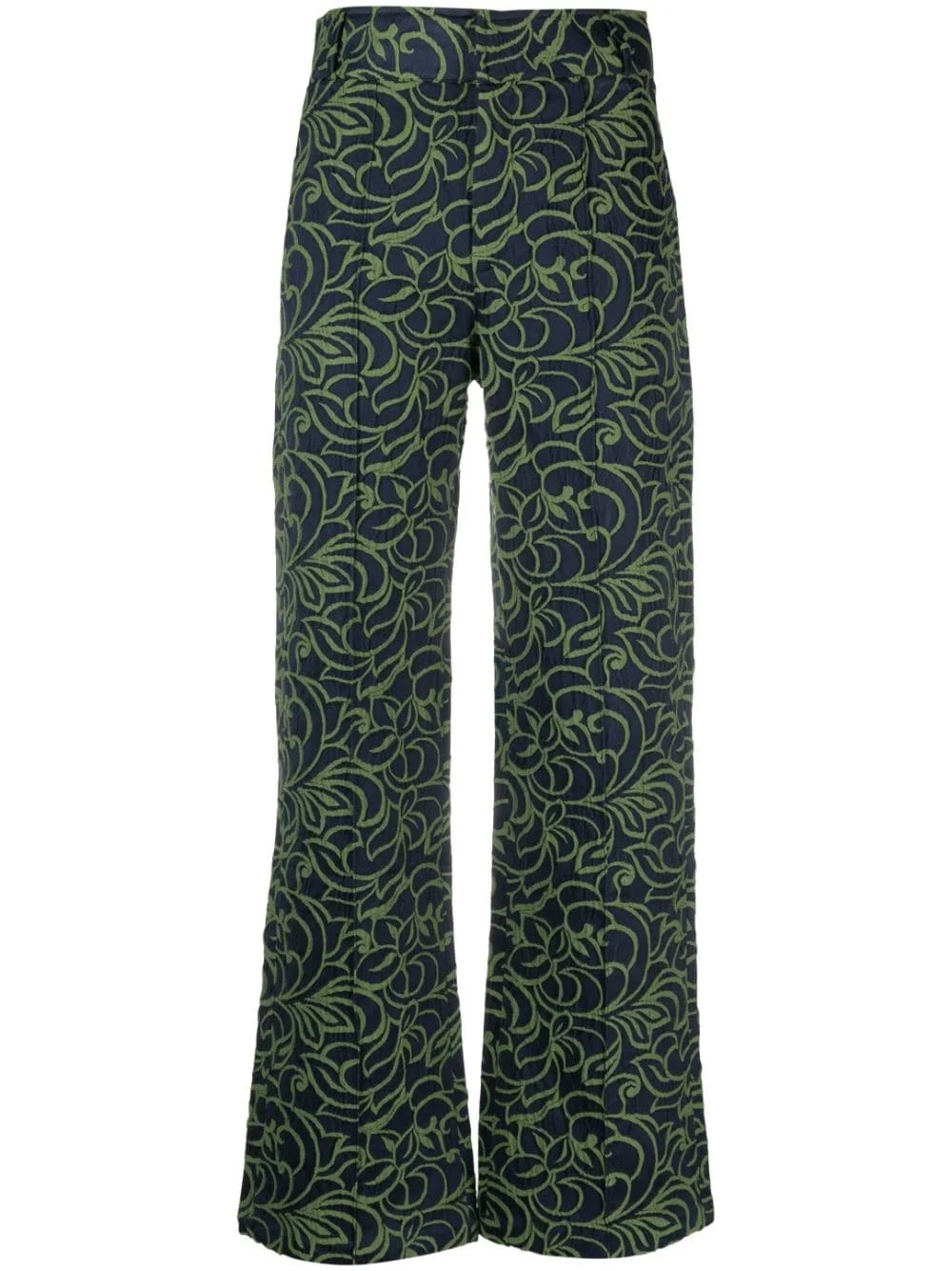 Yoshitomo jacquard trousers Highlights - Olive green/navy blue - Cotton blend - Full jacquard - Pressed crease - Straight-leg - Mid-rise - Belt loops - Concealed front fastening Imported Composition Polyester 68%, Cotton 26%, Acrylic 6% SIZE & FIT Model measurements Height 5 ft 9 in(1.76 m) Bust/Chest 33.07 in(84 cm) Hips 34.64 in(88 cm) Waist 25.59 in(65 cm) FittingInformation Designed with a flared hem, these trousers allow for a close fit at the waist with a slim fit over the leg and widening towards the hem Made from a midweight non-stretch fabric This piece fits small – take one size up