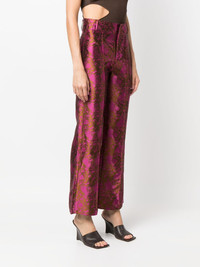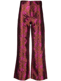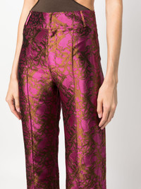 Yoshitomo jacquard trousers Highlights - Fuchsia pink/chocolate brown - Full jacquard - Pressed crease - Straight-leg - Mid-rise - Belt loops - Concealed front fastening Imported Composition Acetate 50%, Viscose 50% SIZE & FIT Model measurements Height 5 ft 9 in(1.76 m) Bust/Chest 33.07 in(84 cm) Hips 34.64 in(88 cm) Waist 25.59 in(65 cm) FittingInformation Designed with a flared hem, these trousers allow for a close fit at the waist with a slim fit over the leg and widening towards the hem Made from a lightweight non-stretch fabric This piece fits true to size – take your usual size