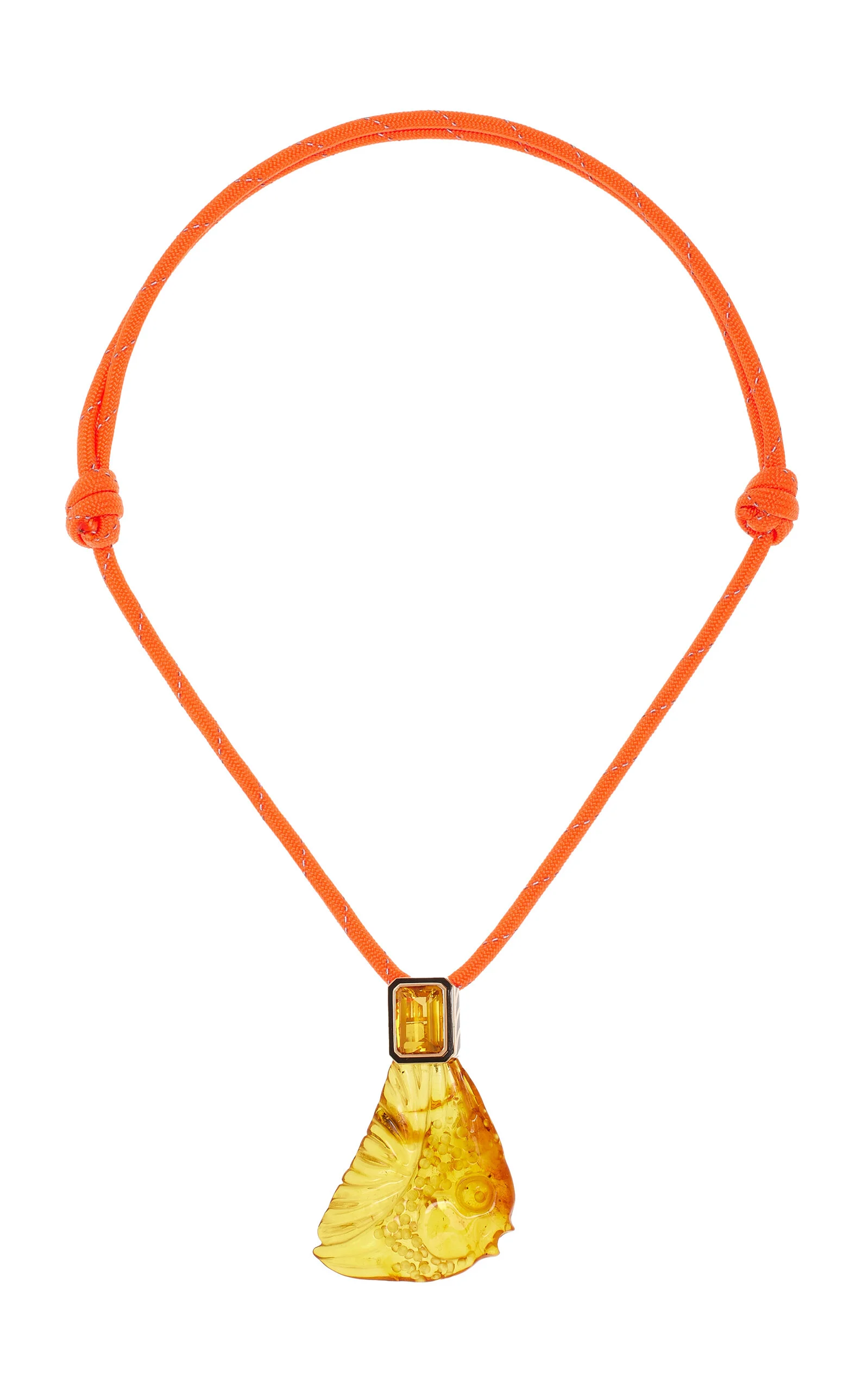 Founded in 2006 by Sara Beltran, Dezso is inspired by the El Paso native's travels and love and respect for the ocean. PRODUCT DETAILS - Knotted fastening - Composition: 18K Gold, Carved Amber, Citirne, Black Enamel, Orange Surf Cord - Imported - Please note the possibility of natural inclusions in gemstones