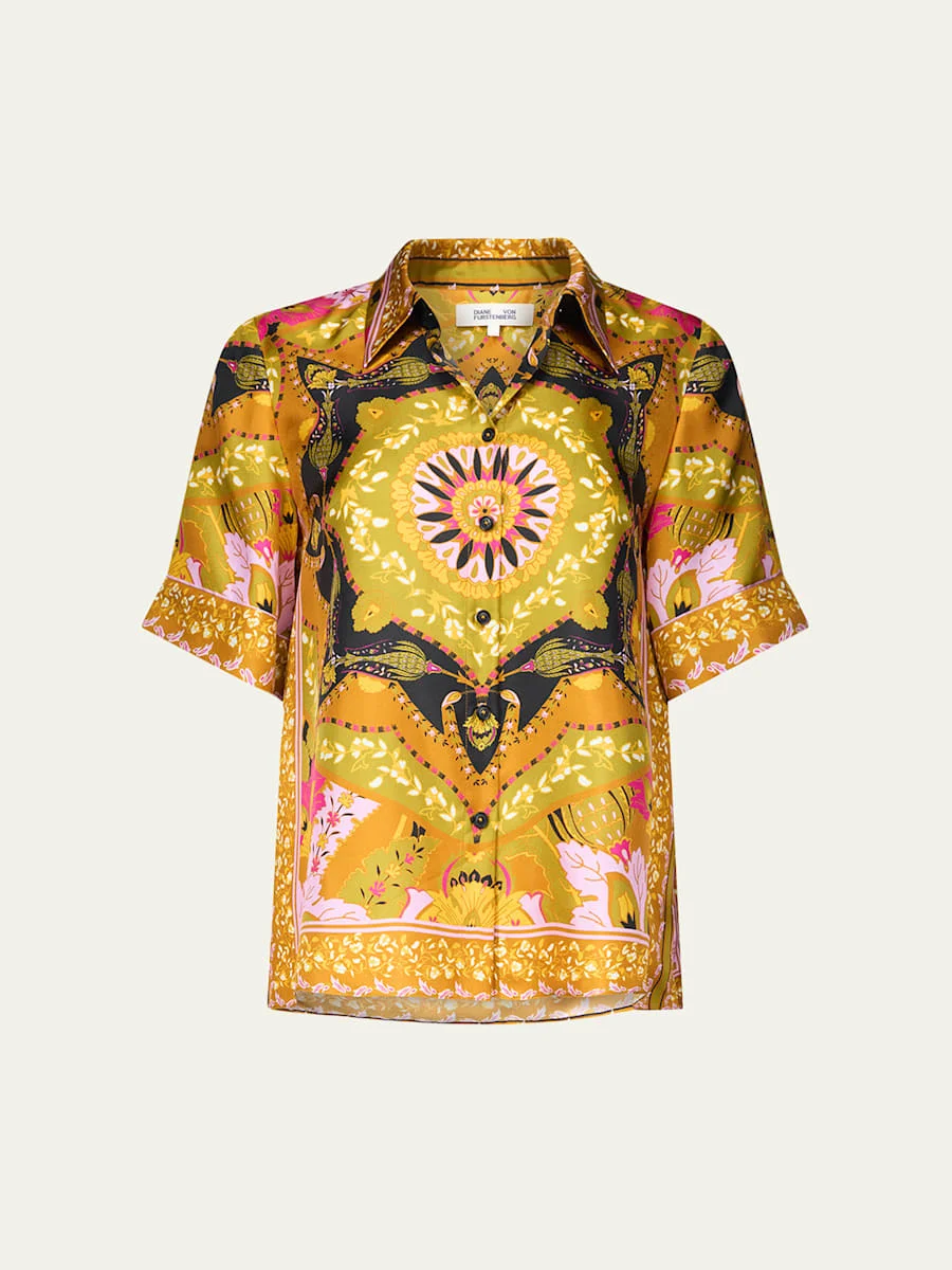 The "Alexa" shirt from Diane von Furstenberg is cut from fluid silk with a symmetric floral print Spread collar; button front Elbow sleeves Boxpleated back yoke Highlow hem Relaxed fit Silk Imported
