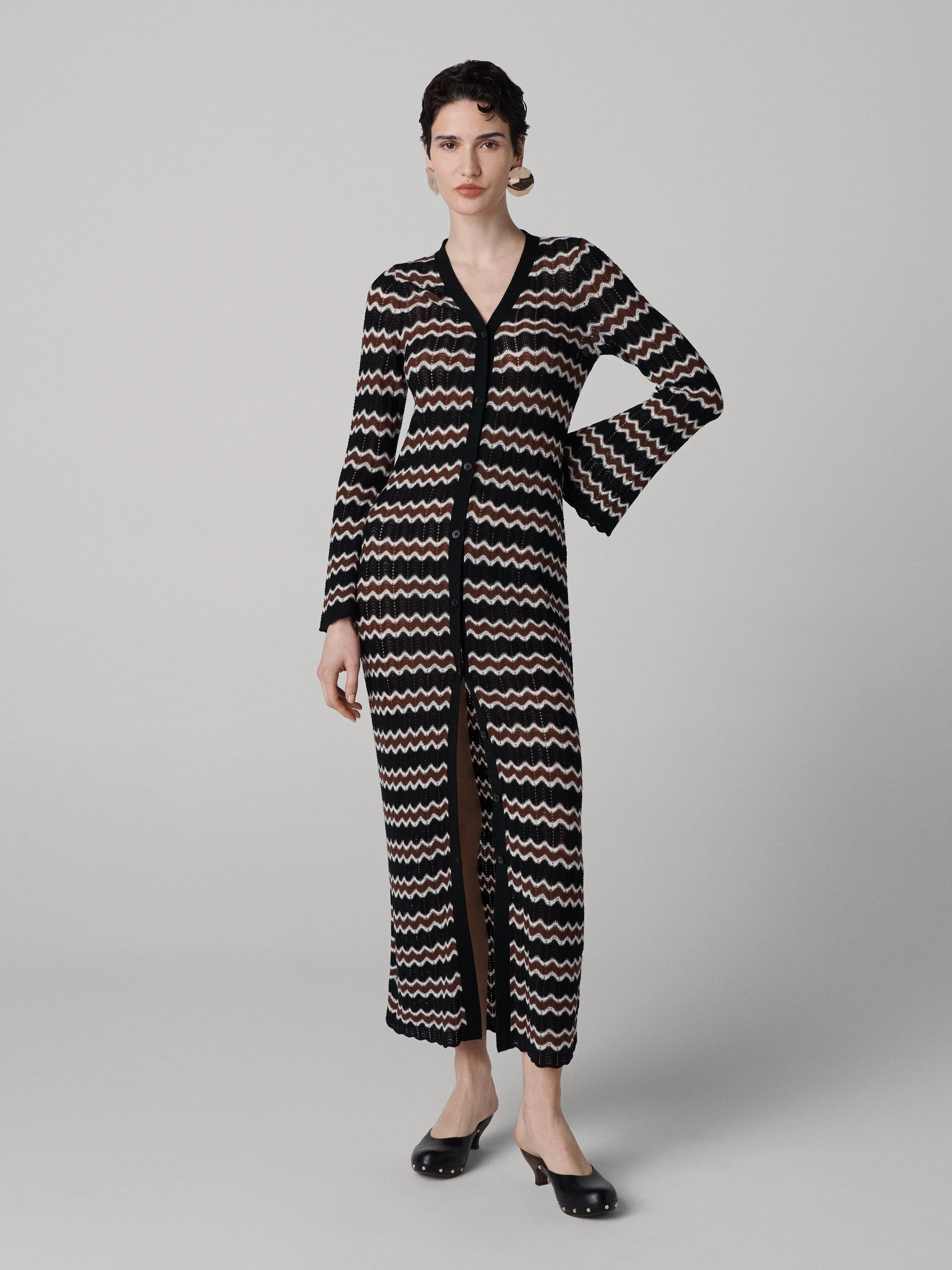 Made from 100% Merino wool, the Alice Long Cardigan has an ultra-soft, luxurious feel. - Deep V-neckline - Long sleeves - Buttons up the front - Scalloped detail on the sleeves and hem - Long length Size & Fit Tatia is 5'11" and wearing a size XS Fabric & Care 100% Extra fine Merino Wool