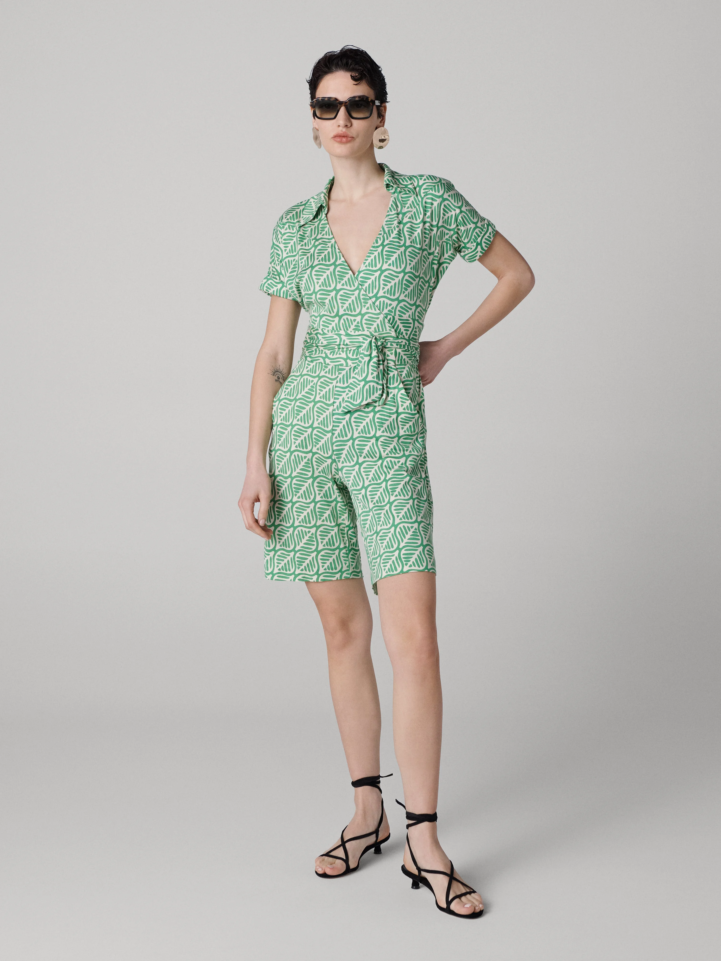 Cut from our signature silk jersey, the Cheryl Jumpsuit is a soft, luxurious piece that combines our iconic wrap silhouette with bermuda shorts. - Classic collar - V-neckline - Short sleeves - True wrap closure - Matching waist-defining tie - Bermuda shorts that fall above the knee Size & Fit Tatia is 5'11" and is wearing a size XS Fabric & Care Silk jersey is our signature. Discovered by Diane in the 70s, this fabric has an effortless feel with a hint of stretch and a polished, elegant look. 100% Silk Jersey
