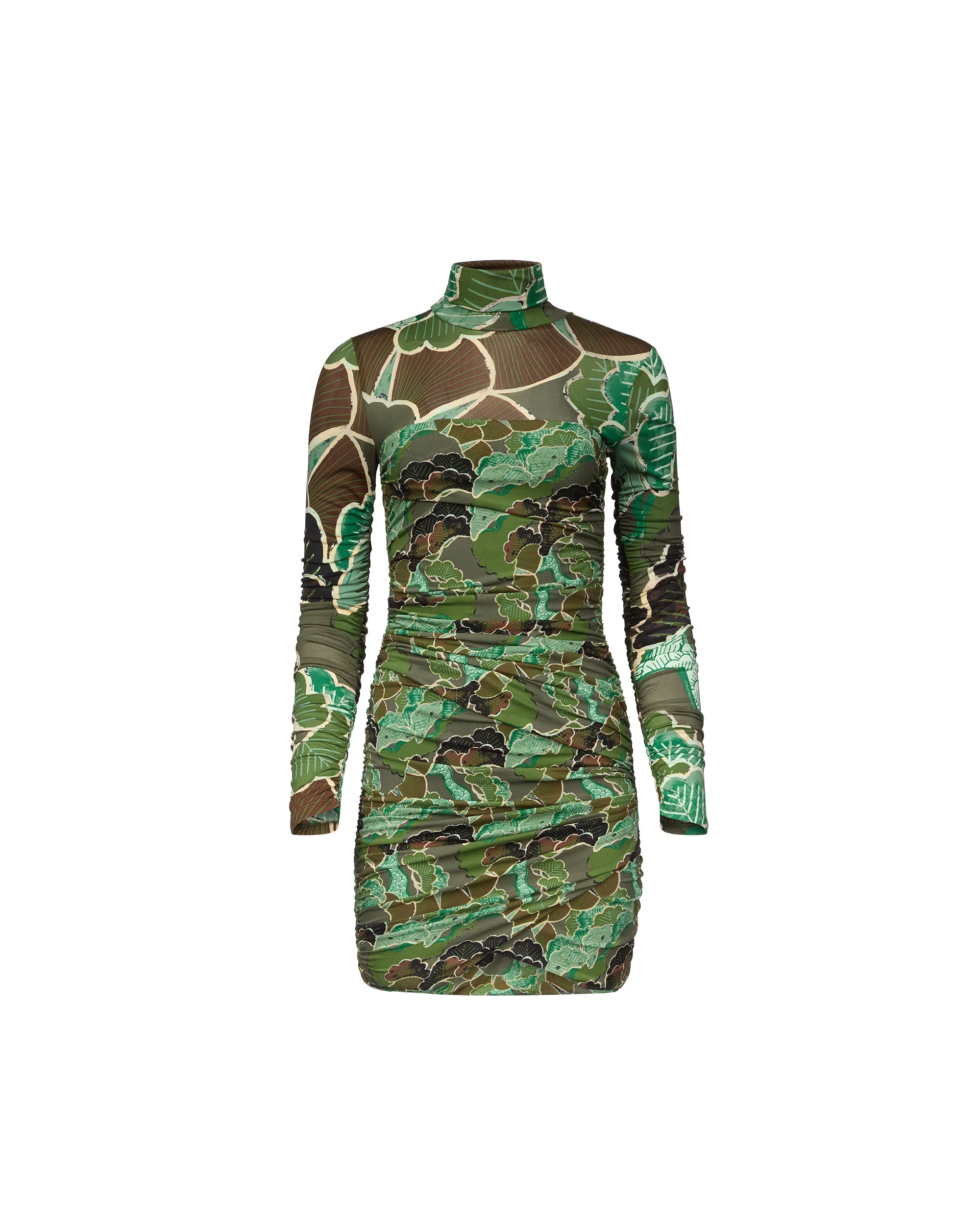 The Clarabella Dress is a sleek mini crafted from smooth jersey with a bold camo print for a modern, stylish look. - Mock neck - Long sleeves - Fitted throughout - Ruched bodice - Mini length Size & Fit Anais is 5'10" and is wearing a size XS Fabric & Care A soft, smooth jersey with a clean finish that takes well to bright, bold prints. 100% Viscose