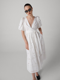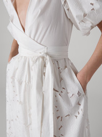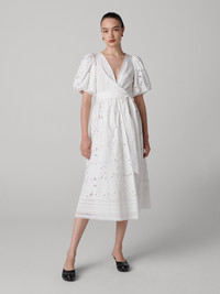 Crafted from a detailed cotton eyelet, the Delilah Wrap Dress has an elevated look and a textured feel. - 98% Cotton, 2% Spandex - V-neckline - Floral eyelet detailing - Puffed cinched sleeves - True-wrap closure - Matching waist-cinching tie - Pockets - Full skirt - Midi length Size & Fit Sasha is 5'10" and is wearing a size XS Fabric & Care A soft, light natural fabric that creates structured silhouettes with a hint of stretch for extra comfort. 98% Cotton 2% Spandex