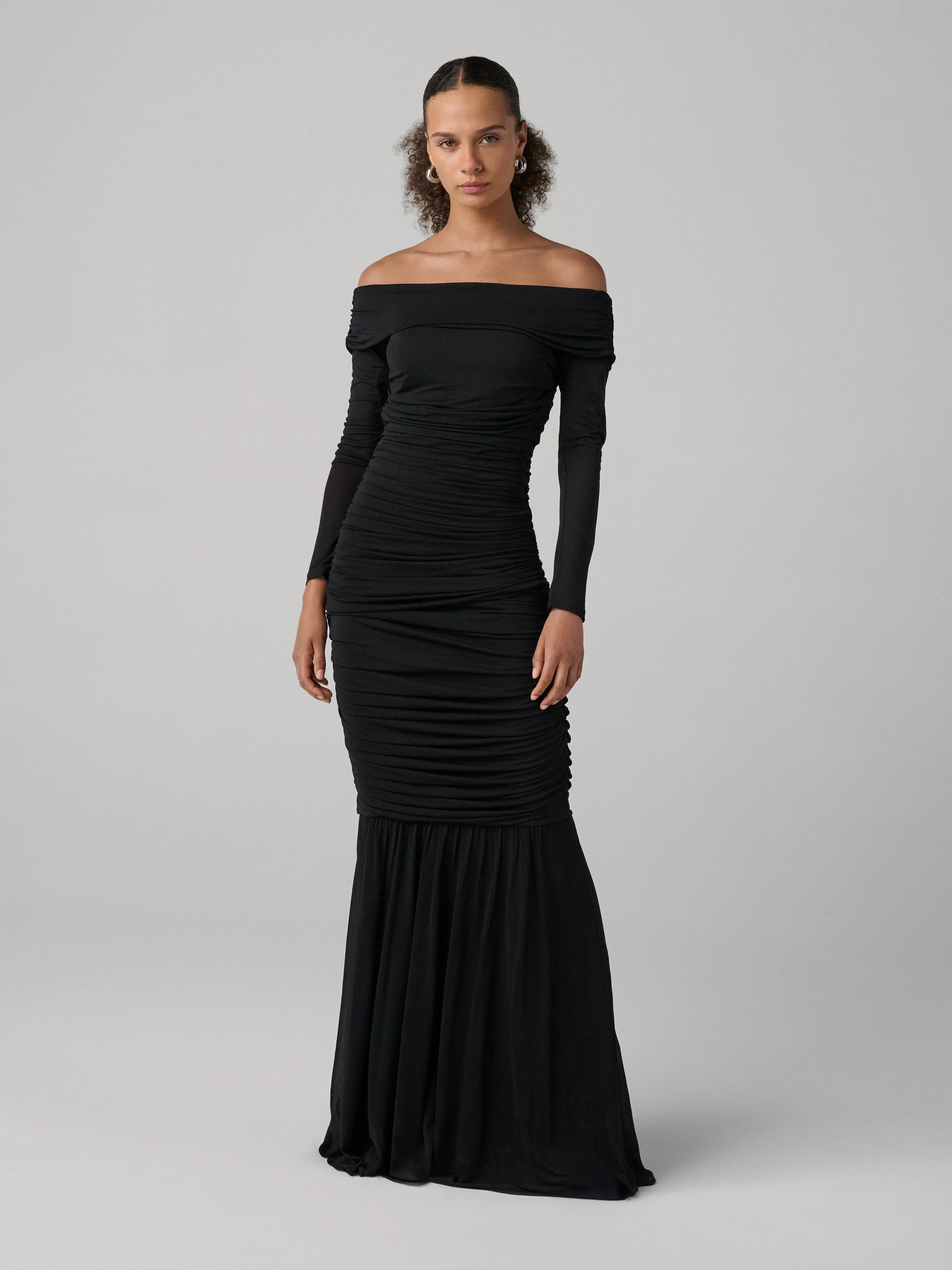 Cut from our new tissue jersey, the Delphina Dress sits off the shoulders with a soft and effortless drape. - Off the shoulder - All over ruching - Long sleeves - Pleated skirt - Maxi Length Size & Fit Ruby is 5'9" and is wearing a size XS Fabric & Care An ultra-light and stretchy evolution of our jersey that creates soft, slinky silhouettes. 100% Viscose Dry Clean Only