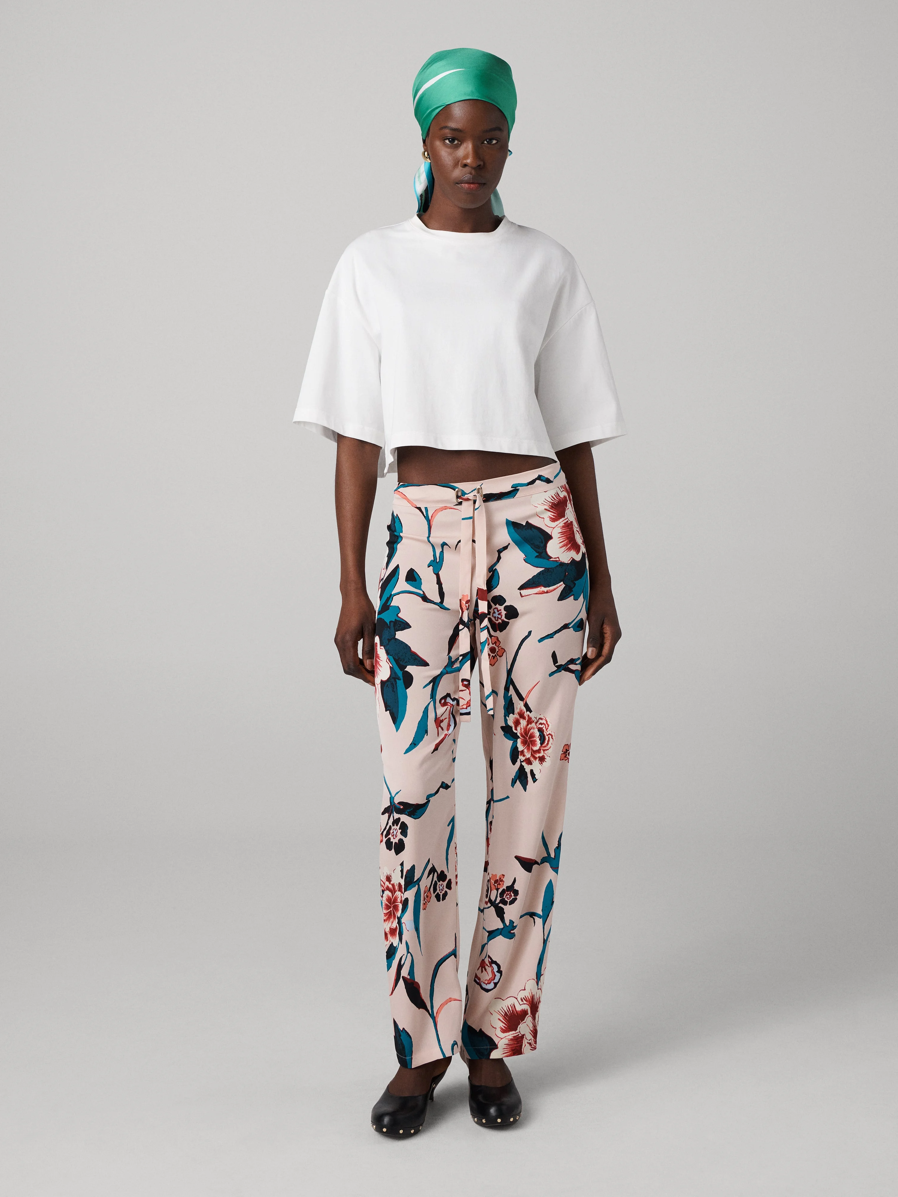 Straight from Diane's suitcase. Cut from a soft, silk georgette, the Diane pants carry her effortless essence. - Stretch waistband - String tie for a cinched custom fit - Straight leg - Make it a set with our matching Long Sleeve Shirt Size & Fit Isha is 5'10" and is wearing a size XS Fabric & Care With a romantic feel, this fabric has a soft feel and an effortless look. 100% Silk Dry Clean Only