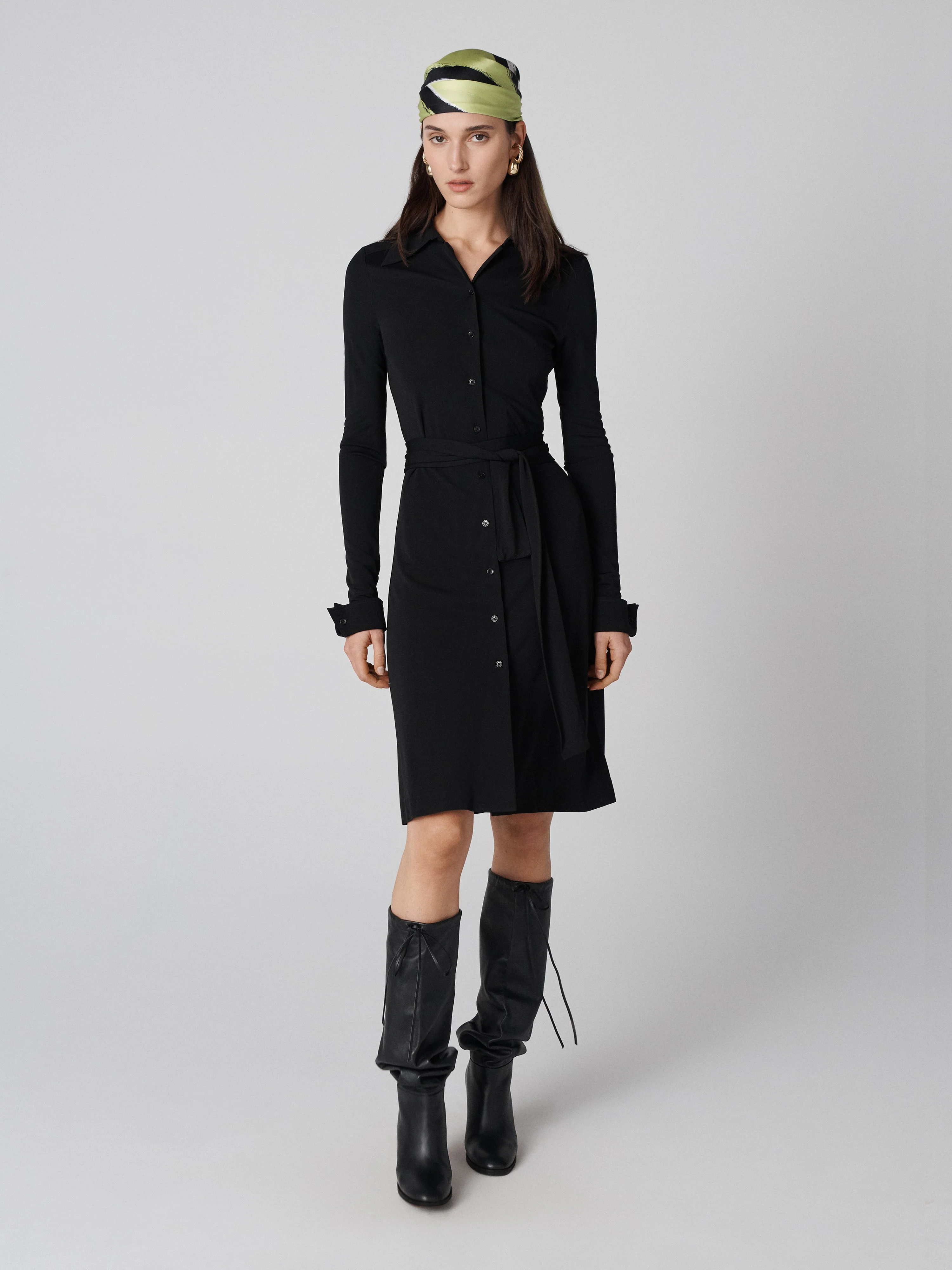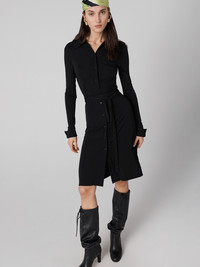 A shirt dress is one of Diane's favorite everyday silhouettes. This solid piece has a tailored look and an effortless feel in a soft matte jersey. - Classic collar - Buttons lining the bodice - Long cuffed sleeves - Matching waist-cinching tie - Falls around the knee Size & Fit Rachelle is 5'11" and wearing a size XS Fabric & Care A soft, smooth jersey with a clean finish that takes well to bright, bold prints. 100% Viscose Interlock