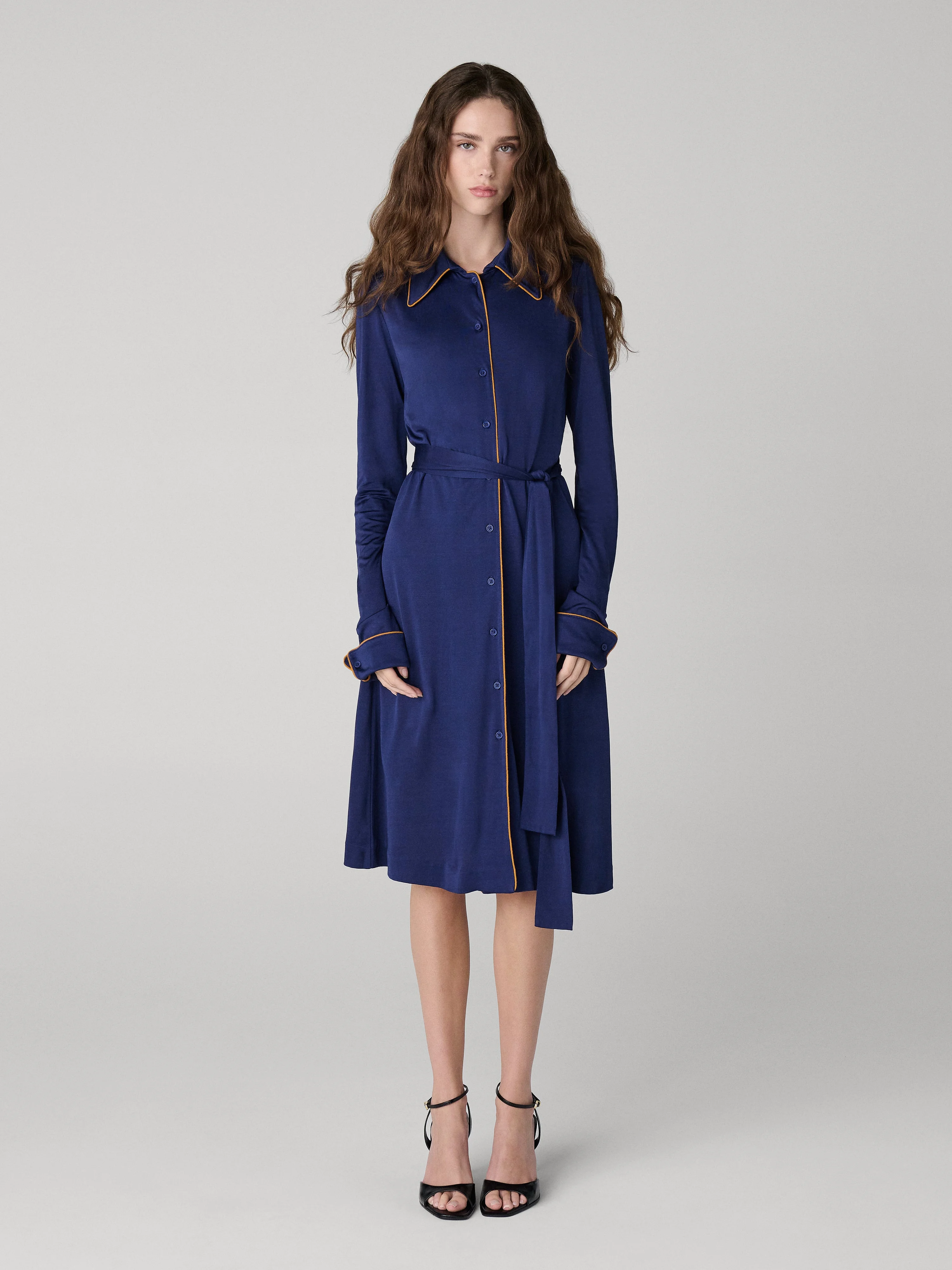 A shirt dress is one of Diane's favorite everyday silhouettes. This solid piece has a tailored look and an effortless feel in a soft modern jersey. - Classic collar - Buttons lining the bodice - Long cuffed sleeves - Matching waist-cinching tie - Falls around the knee Size & Fit Olivia is 5'10.5" and is wearing a size XS Fabric & Care Ultra-soft, this jersey evolution has a soft, comfortable feel. 59% Viscose 21% Cotton 20% Modal Jersey