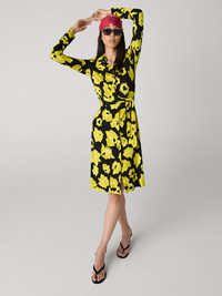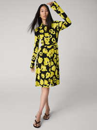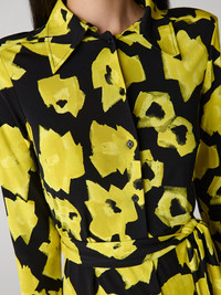 A shirt dress is one of Diane's favorite everyday silhouettes. This bold piece has a tailored look and an effortless feel in a soft matte jersey. - Classic collar - Buttons lining the bodice - Long cuffed sleeves - Matching waist-cinching tie - Falls around the knee Size & Fit Milano is 5'10.5" and is wearing a size XS Fabric & Care Matte Jersey is a soft, smooth jersey with a clean finish that takes well to bright colors and bold prints. 100% Viscose
