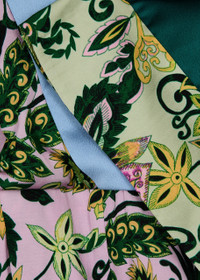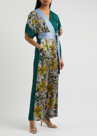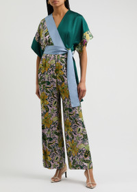 Info & Care Diane Von Furstenberg satin jumpsuit Patchwork print, V-neck at wrap-effect front, dolman sleeves, detachable tie-fastening belt, side slip pockets, pleated details at waist Concealed zip and hook fastening at back; Fabric 1: 100% viscose Dry clean; Size & Fit Length shoulder to hem: 57 inches/ 145cm Midweight Slim fit bodice, wide-leg cut Model is 5'9"/ 175cm and wears a size small