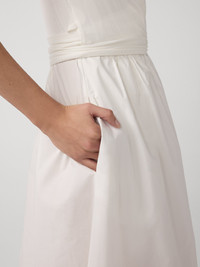 A universally flattering favorite, the Elena Dress features a ribbed jersey bodice contrasted by a light, sculpted skirt. - V neckline - Ribbed bodice - Short sleeve - Pockets - True wrap closure - Midi length Size & Fit Keny is 5'10" and is wearing a size XS Fabric & Care This dress's bodice features our brand new rib jersey featuring a classic ribbed texture with gentle stretch and everyday breathability. The skirt features a soft, light natural cotton poplin fabric that creates structured silhouettes. 95% Viscose 5% Spandex / 100% Cotton Dry Clean Only