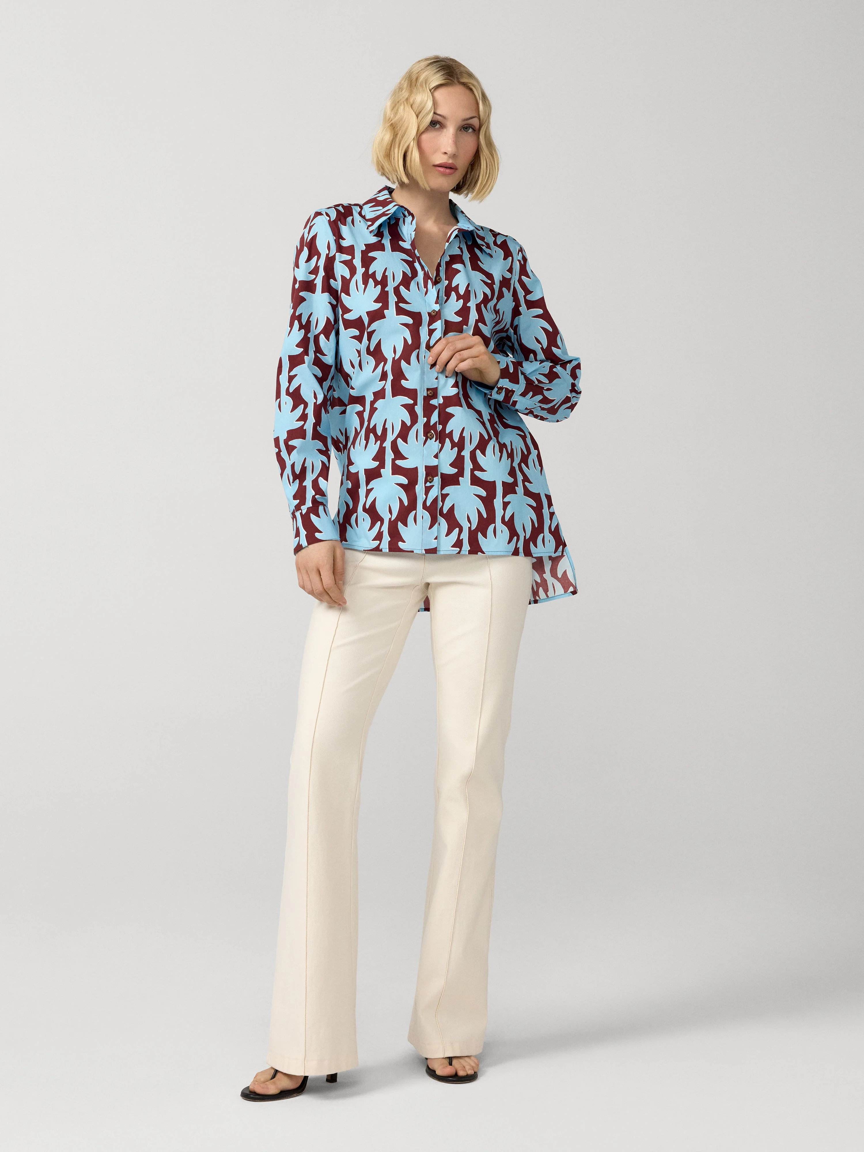 The Ellie Blouse is a lightweight cotton button-down featuring a bold, warm-weather–inspired print, perfect for effortless, on-the-go style. - Collar neckline - Button down - Adjustable sleeves - Waist length, longer in back Size & Fit Jade is 5'9" and is wearing a size XS Fabric & Care A soft, light natural fabric that creates structured silhouettes with a hint of stretch for extra comfort. 98% Cotton 2% Spandex Dry Clean Only