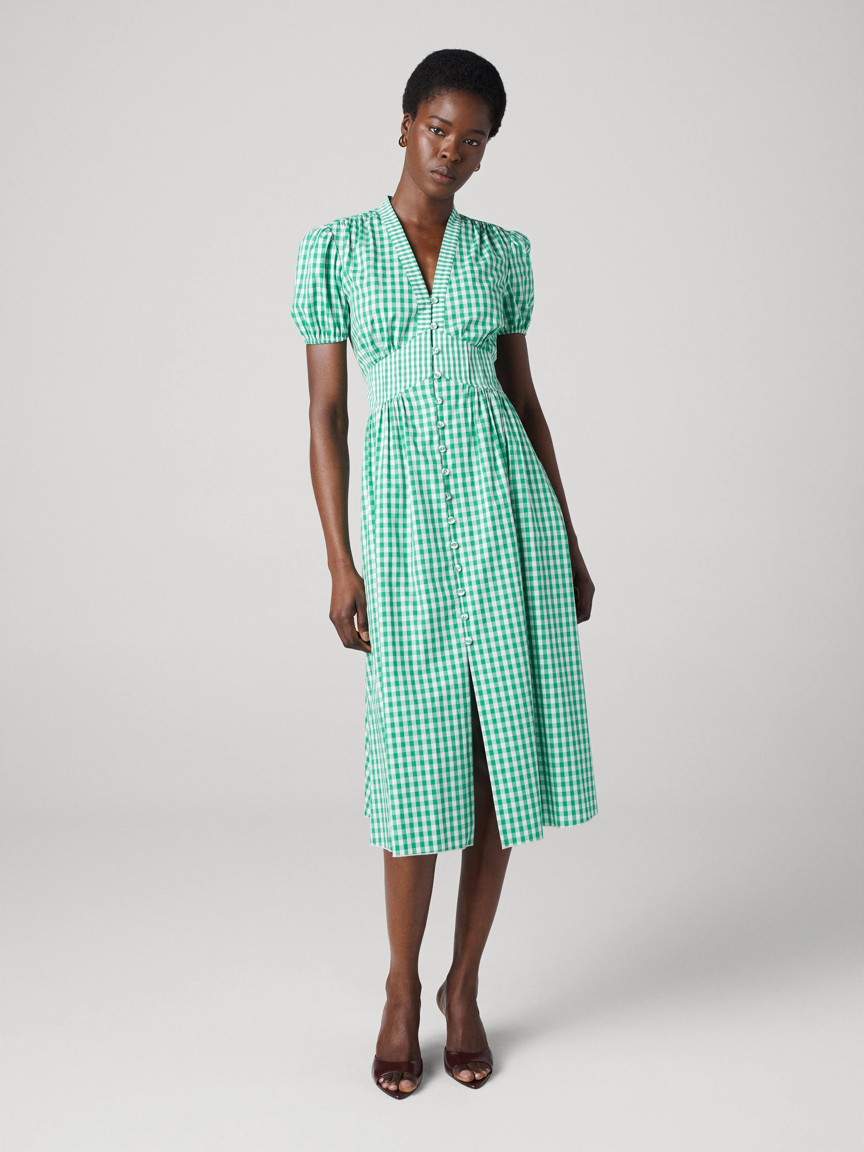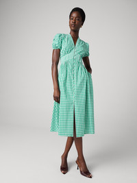In 100% cotton, the Erica midi dress is an elegant any-occasion silhouette that balances softness and structure. - 100% Cotton - Short puffed sleeves with comfortable smocking - Buttons down the front - Cinched waist - Midi length Size & Fit Isha is 5'10 and is wearing a size 2 Fabric & Care Soft to the touch and flawlessly smooth, this natural fabric offers a crisp, high-quality finish. 100% Cotton