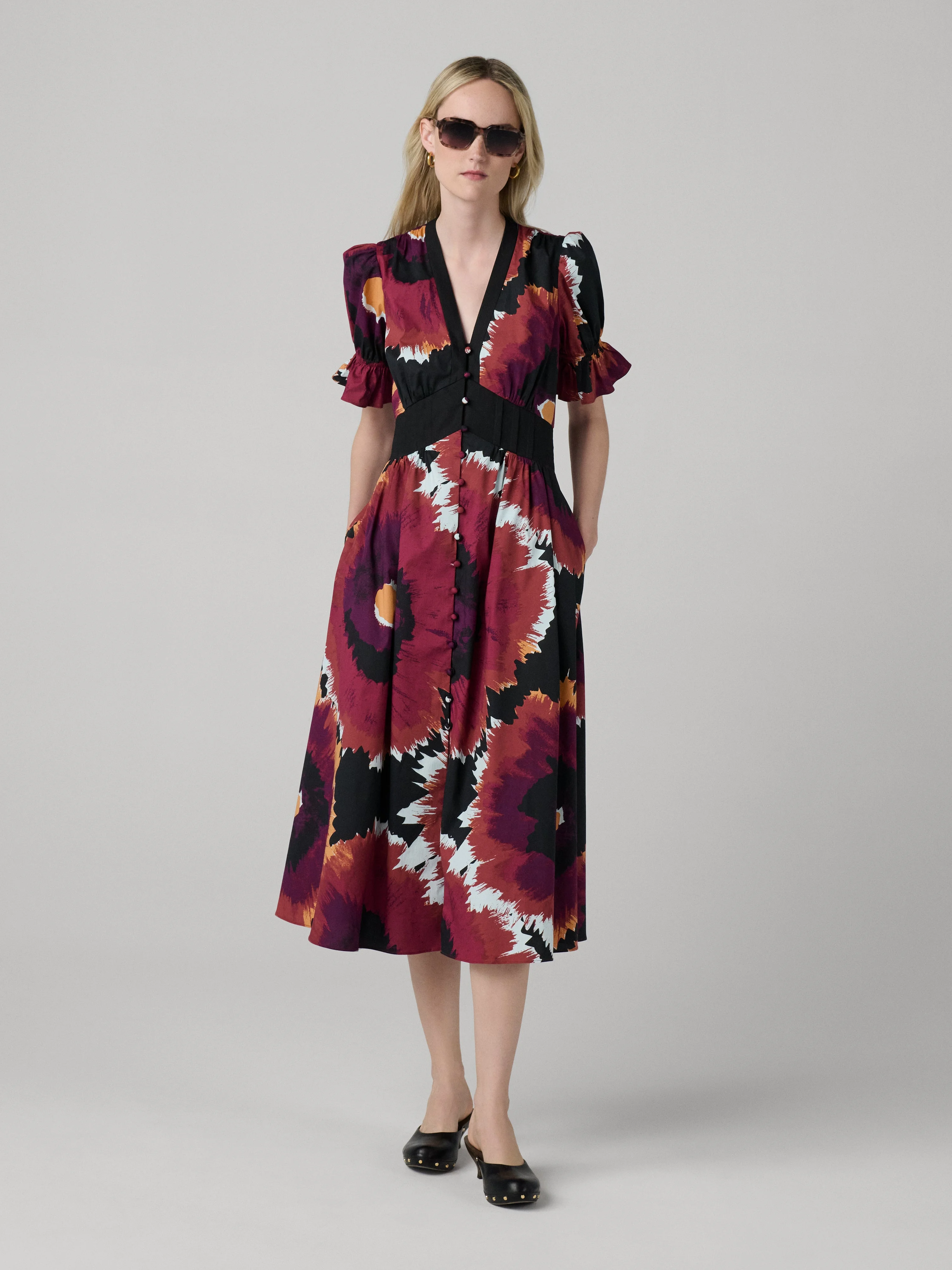 In a light cotton poplin, the Erica midi dress balances softness and structure, hugging you in all the right places. - Short puffed sleeves with comfortable smocking - Buttons down the front - V-neckline - Cinched waist - Smocking across back waistline - Deep pockets - Midi length Size & Fit Harleth is 5'10" and is wearing a size XS Fabric & Care A soft, light natural fabric that creates structured silhouettes with a hint of stretch for extra comfort. 98% Cotton 2% Spandex Dry Clean Only