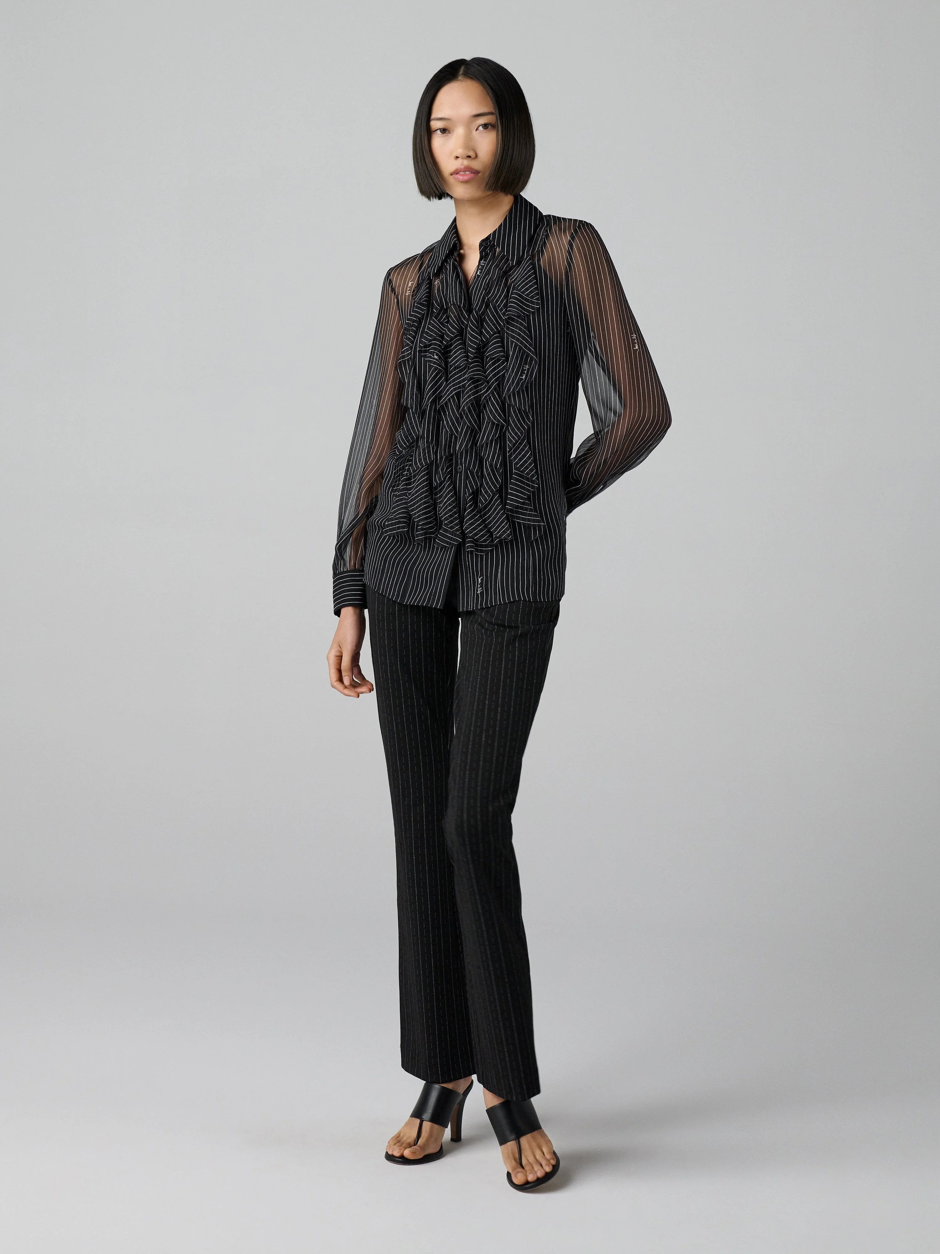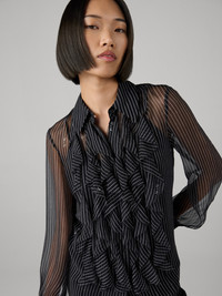 Crafted from 100% Silk, the Eva Blouse features delicate front ruffles and transitions effortlessly from workday to happy hour. - 100% silk - Classic collar - Long sleeve - Ruffles down the front - Sheer with matching slip Size & Fit Anais is 5'10" and is wearing a size XS Fabric & Care With a romantic feel, this fabric has a soft feel and an effortless look. 100% Silk Dry Clean Only