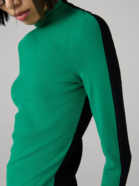 The Jelena Top is a sophisticated soft-knit turtleneck, thoughtfully designed with a color blocked silhouette. - Turtleneck - Ribbed details - Long sleeves - Waist length - Multi-Color Size & Fit Anais is 5'10" and is wearing a size XS Fabric & Care A refined viscose jersey knit with a smooth texture and elegant drape. 83% Viscose 17% Polyester Dry Clean Only