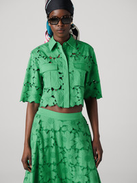 Crafted from stretchy cotton poplin, the Joan Crop Top is a soft, structured piece with a tailored look and floral eyelet details throughout. - Classic collar - Buttons up the front - Breast pockets - Wide half sleeves - Floral eyelet details throughout - Cropped length Size & Fit Isha is 5'10" and is wearing a size XS Fabric & Care A soft, light natural fabric that creates structured silhouettes with a hint of stretch for extra comfort. 98% Cotton 2% Spandex