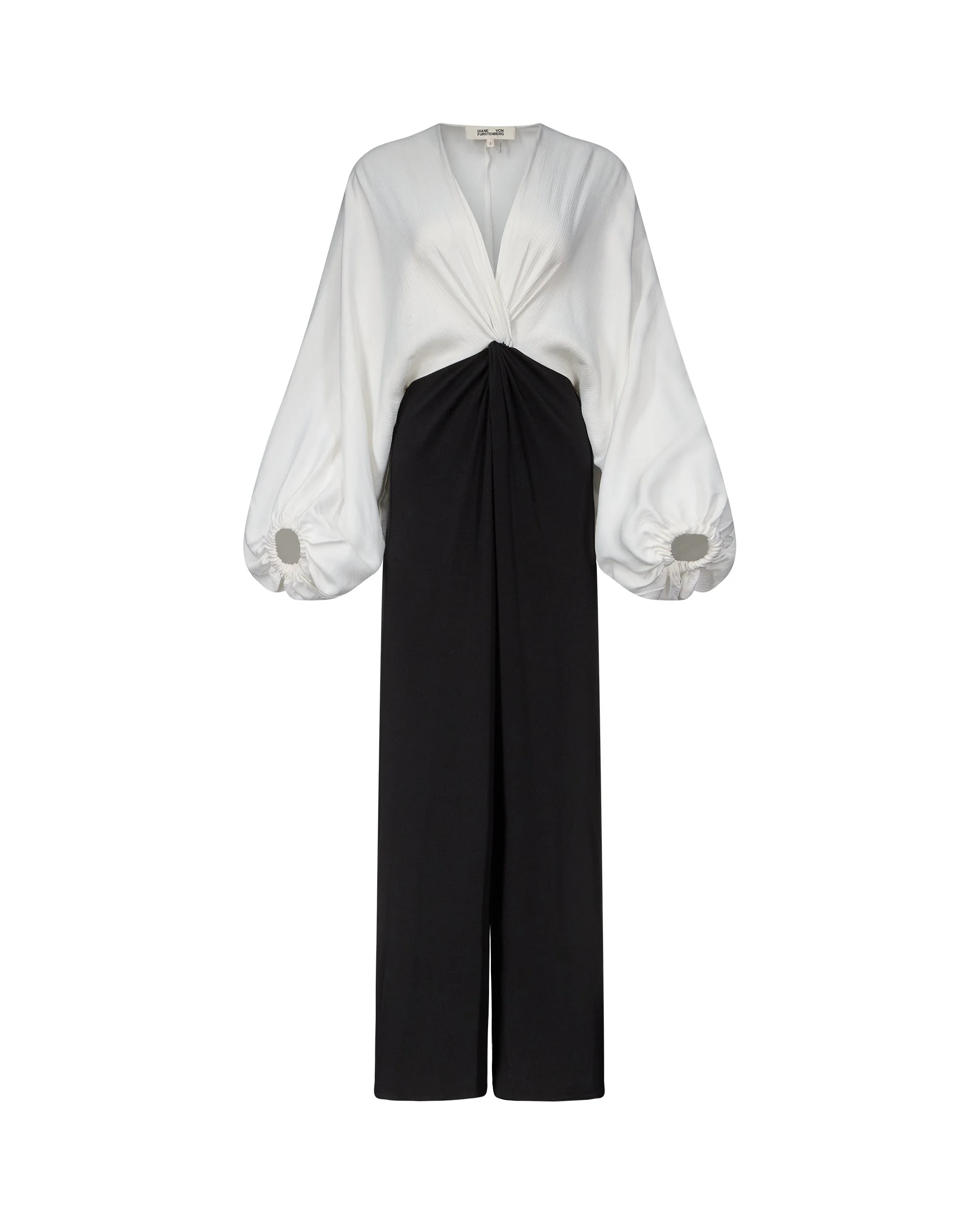 A modern take on our classic Kason Dress, the Kason Jumpsuit offers the same flattering fit with the ease of a tailored jumpsuit silhouette. - V neckline - Knot at center - Long billowing sleeves with a cinched cuff - Wide leg - Full length Size & Fit Harleth is 5'10" and is wearing a size XS Fabric & Care This fabric presents the smooth shine of satin with a soft, subtly textured finish 59%Viscose 41% Rayon Dry Clean Only