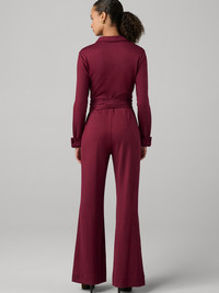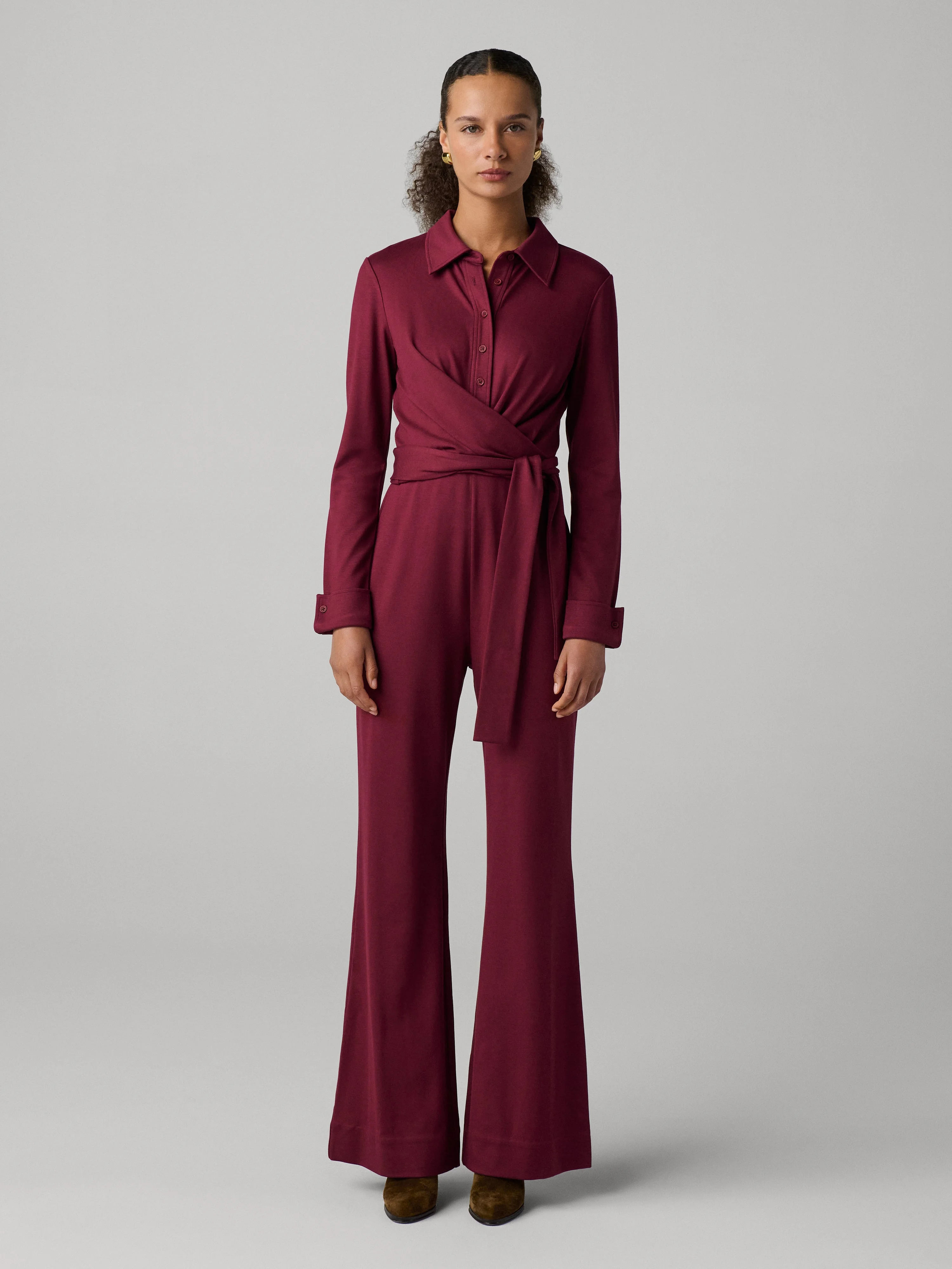 Straight out of the 70s, the best-selling Michele jumpsuit is a shape jersey piece made for movement, inspired by Diane's Studio 54 days. - Close fit - Classic collar - Buttons to the waist - Waist-defining matching belt - Straight leg with flare Size & Fit Ruby is 5'9" and is wearing a size XS Fabric & Care Shape Jersey is structured yet fluid, this jersey is perfect for creating comfortable suiting or sculpting dresses with a smooth, clean finish. 87% Viscose, 10% Nylon 3% Spandex