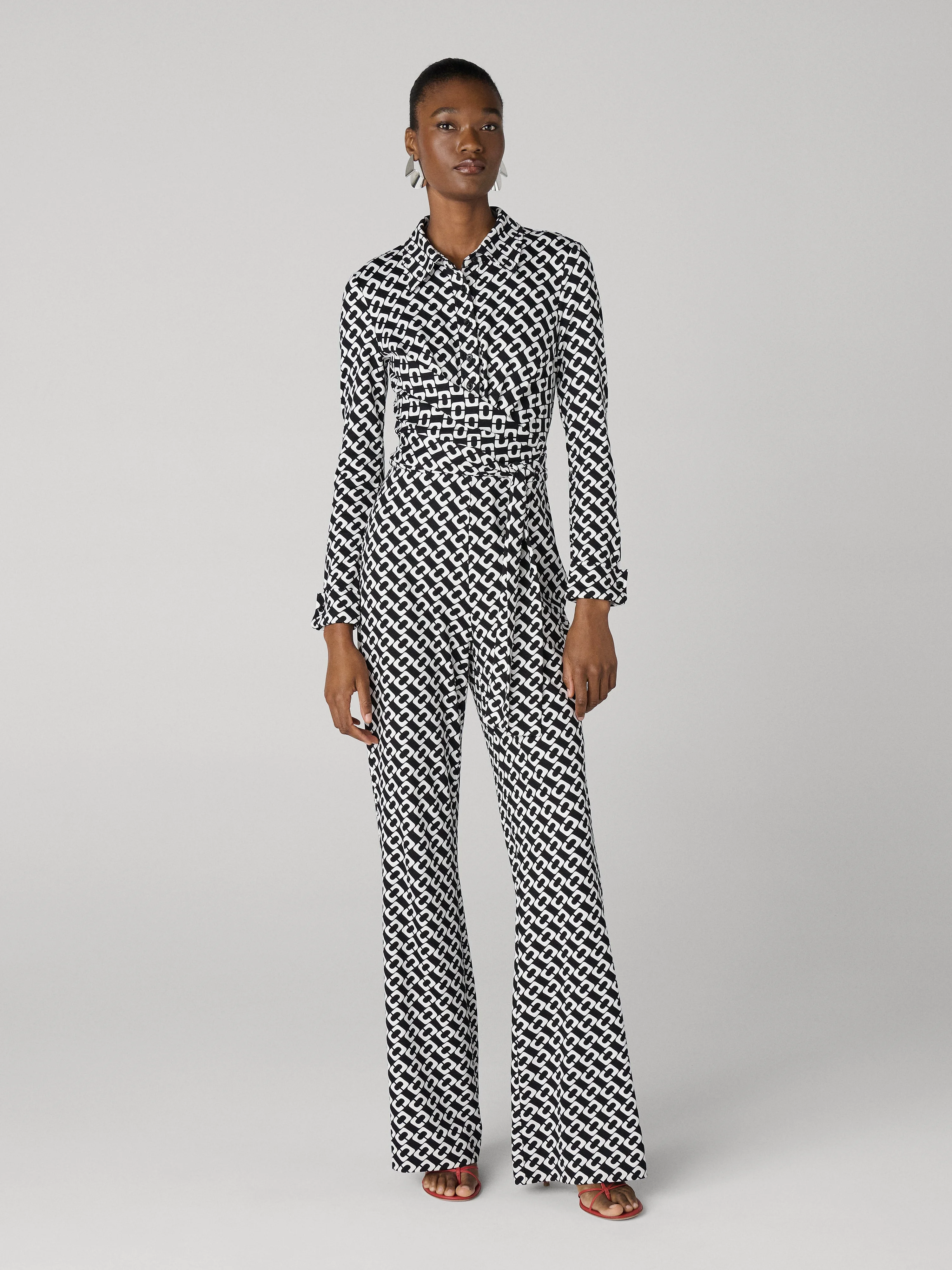 Straight out of the 70s, the best-selling Michele jumpsuit is a shape jersey piece made for movement, inspired by Diane's Studio 54 days. - Close fit - Classic collar - Buttons to the waist - Waist-defining matching belt - Straight leg with flare Size & Fit Naki is 5'11" and is wearing a size XS Fabric & Care Shape Jersey is structured yet fluid, this jersey is perfect for creating comfortable suiting or sculpting dresses with a smooth, clean finish. 87% Viscose, 10% Nylon 3% Spandex