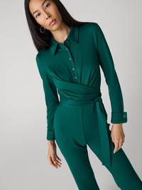 Straight out of the 70s, the best-selling Michele jumpsuit is a shape jersey piece made for movement, inspired by Diane's Studio 54 days. - Close fit - Classic collar - Buttons to the waist - Waist-defining matching belt - Straight leg with flare Size & Fit Milano is 5'10.5" and is wearing a size XS Fabric & Care Shape Jersey is structured yet fluid, this jersey is perfect for creating comfortable suiting or sculpting dresses with a smooth, clean finish. 87% Viscose, 10% Nylon 3% Spandex