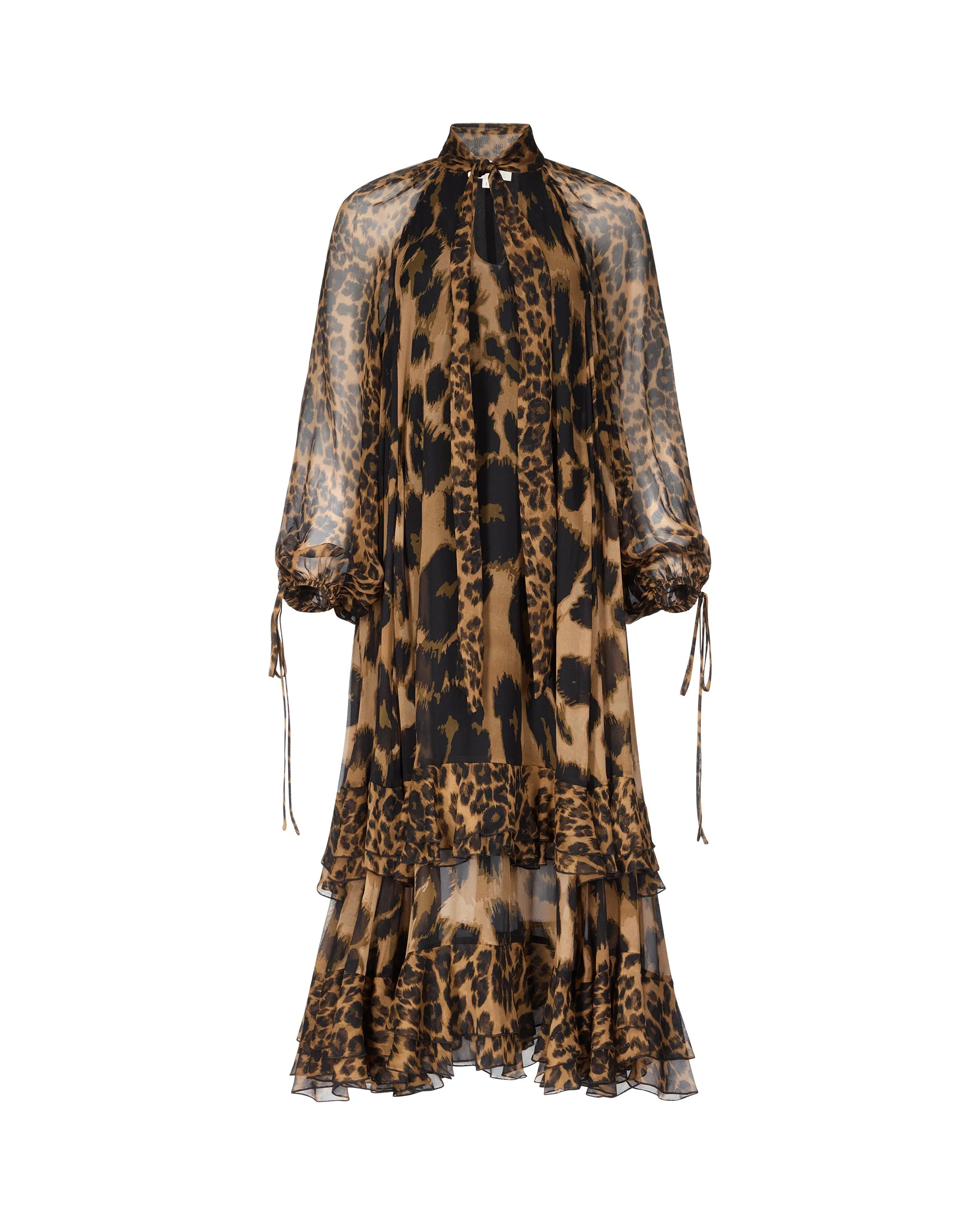 Crafted from silk chiffon, the Nadine Gown commands attention with its flowy silhouette, tie neckline, and striking ruffle hem. - Adjustable neck tie - Loose long sleeves with tie at wrist - Tiered skirt - Maxi length - Comes with matching slip Size & Fit Anais is 5'10" and is wearing a size XS Fabric & Care With a romantic feel, this fabric has a soft feel and an effortless look. 100% Silk 100% Polyester Slip Dry Clean Only