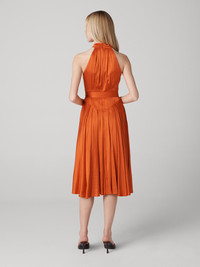Crafted from soft, stretchy satin with a subtle shimmer, the Nicola Dress is effortlessly elegant. - Halter neckline - Sleeveless - Pleating throughout - Matching waist defining belt - Falls around the knee Size & Fit Afra is 5'9" and is wearing a size 2 Fabric & Care With a silky surface and sultry drape, Stretch Satin is ultra effortless, balancing softness and stretch. 53% Viscose 44% Rayon 3% Spandex