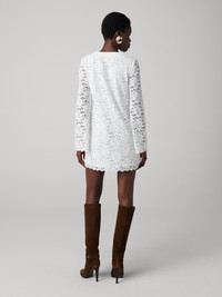The Parker Mini Dress has a comfortable feel yet a delicate look, with sheer lace sleeves and scalloped trim. - Round neckline with tie detail and solid trim - Unlined long sleeves with scalloped edges - Mini length - Scalloped hem Size & Fit Isha is 5'10" and wearing a size XS Fabric & Care Delicate yet durable, our lace is feather-light and falls elegantly in each silhouette. 90% Nylon 10% Polyester