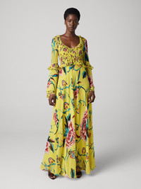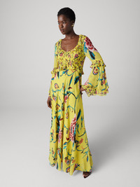 Cut from our textured chiffon, the Quinn Dress has subtle texture and a light drape. - Subtle V-neckline - Ruffle details around the neck, waist, and sleeves - Long bell sleeves - Maxi length Size & Fit Isha is 5'10" and is wearing a size XS Fabric & Care A soft, light chiffon with a romantic drape and a textured feel. 100% Viscose