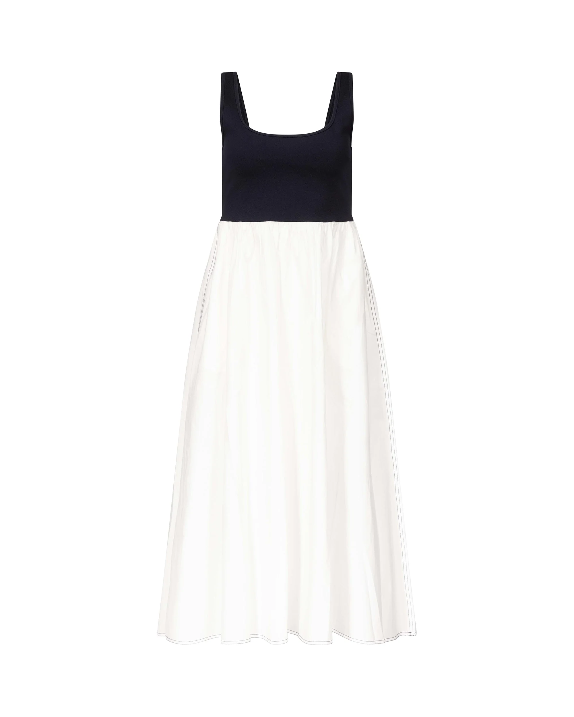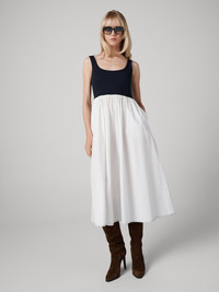 The Selena midi dress hugs you in all the right places with a stretchy ponte bodice balanced by a cotton poplin A-line skirt. - Sleeveless with supportive straps - Scoop neckline - Low-cut back - Ponte tank-style top, cotton poplin skirt - Full skirt with pockets - Midi length Size & Fit Afra is 5'9" and is wearing a size XS Fabric & Care A soft, light natural fabric that creates structured silhouettes with a hint of stretch for extra comfort. 98% Cotton 2% Spandex