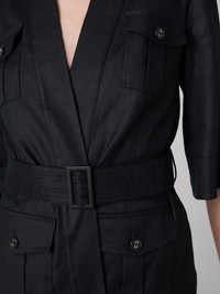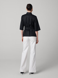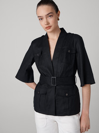 Crafted from a stretchy linen, the Shelby Jacket has a comfortable feel and a workwear-inspired look. - V-neckline - Breast pockets and side pockets - Flared half sleeves - Matching waist-cinching belt - Falls around the hips Size & Fit Sasha is 5'10" and is wearing a size XS Fabric & Care Stretch Linen, our new natural fabric, has a light, luxurious feel, and a subtly structured look. 55% Linen 43% Tencel Lyocell 2% Spandex