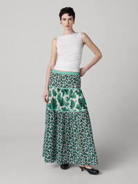 Crafted from a silk-cotton blend, the Shiloh Skirt features contrasting prints and has a light and luxurious drape. - 72% Cotton, 28% Silk - Low-rise fit - Contrasting prints - Full tiered skirt - Maxi length Size & Fit Tatia is 5'11" and is wearing a size XS Fabric & Care Ultra soft and light, this silk-cotton blend has a romantic, delicate drape. 72% Cotton 28% Silk