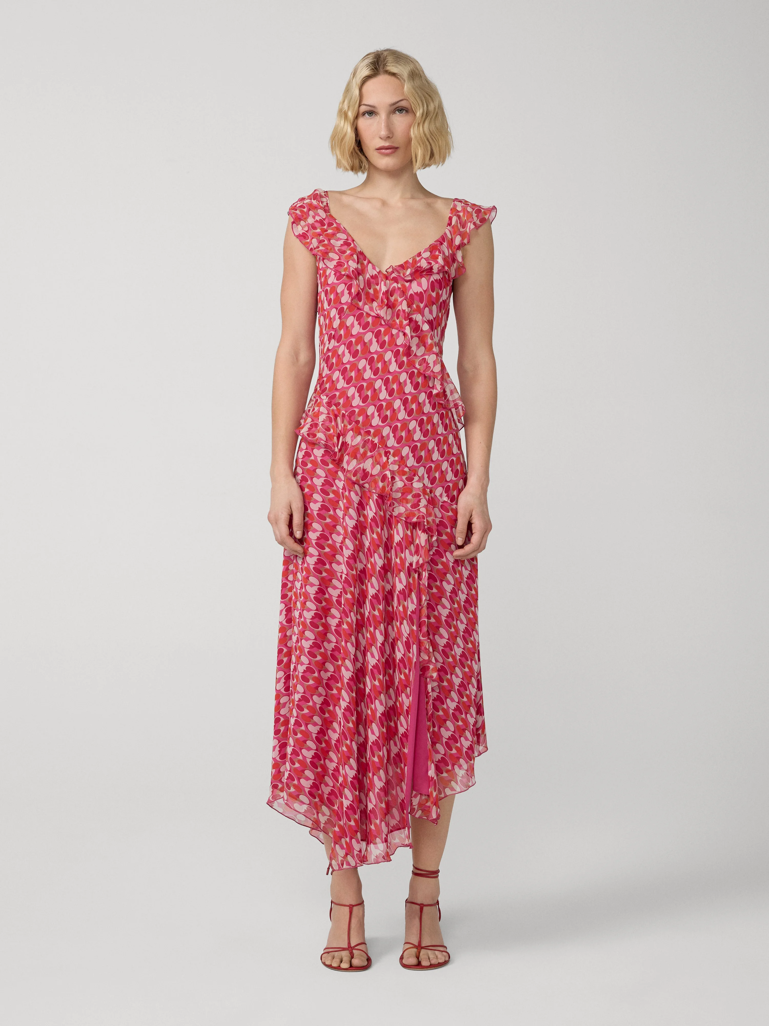 The Sloane Dress features a soft, feminine silhouette finished with bold ruffles and a playful print. - V neckline - Sleeveless - Asymmetrical sleeve ruffle - Ruffles throughout - Midi length Size & Fit Jade is 5'9" and is wearing a size XS Fabric & Care This chiffon is light to the touch and takes well to dreamy layering. 100% Viscose Dry Clean Only